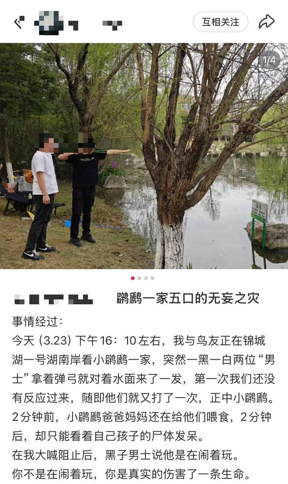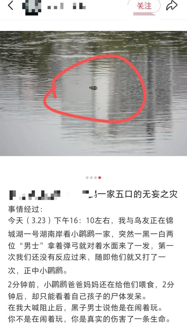 李女士(化名)是当天此事的直接目击者。她告诉记者,事发时间是在23日当天下午16:10分左右,她与朋友正在锦城湖一号湖南岸看小䴙䴘一家,突然一名黑衣和一名白衣两位男士拿着弹弓,对着水面射击。