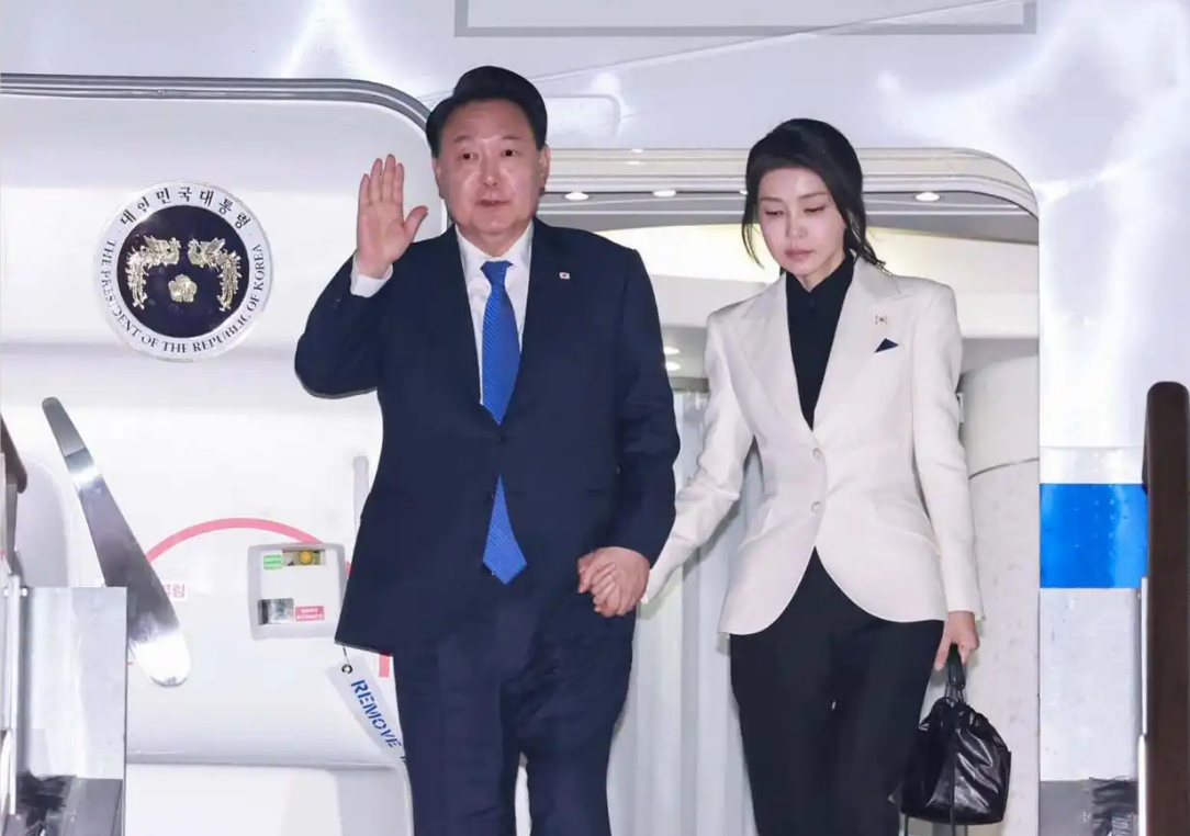 当地时间2024年7月12日,韩国首尔,北约峰会结束后,韩国总统尹锡悦和第一夫人金建希乘专机回到首尔。韩联社
