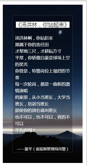 15首由四川监狱民警原创的诗歌,组成信仰之光、使命之光、大爱之光三个篇章,从不同侧面深度反映了汤洪林同志对党忠诚、勇于担当、甘于奉献、廉洁无私的一生。一首《爸爸 您藏哪儿》,表达了家人对他的无尽思念,现场听众无不为之动容,掌声经久不息……