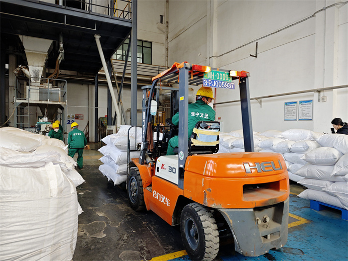 餐厨垃圾处理厂成品车间,叉车师傅正将一袋袋已完成打包的生物复合蛋白肥料运输至堆放点。