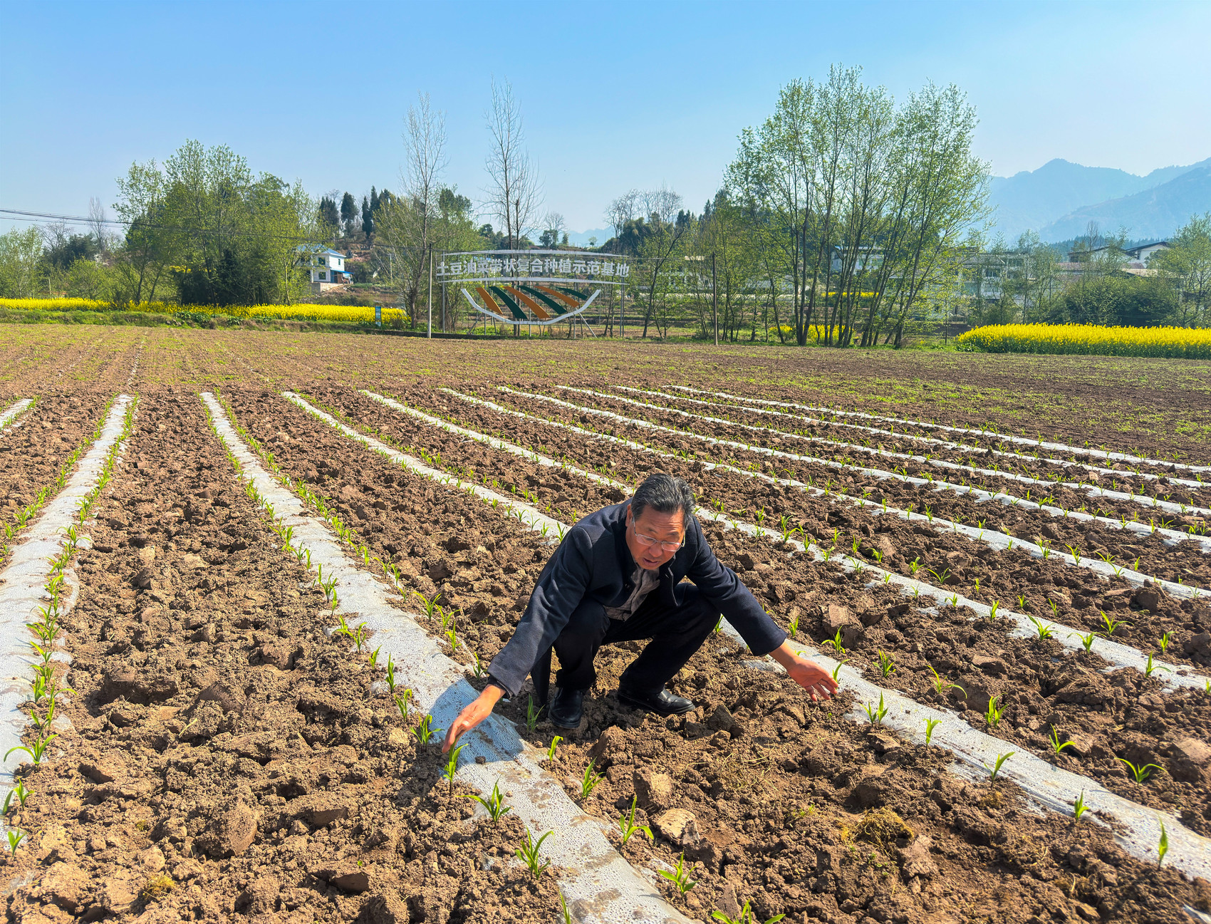 来到新芽村农村公路旁的千亩玉米高产示范片,2月底采取薄膜覆盖播下的玉米种,幼苗已经长到10厘米高,有三四片叶片,玉米宽行距保持1.5米。“这是我们特地推广的规范留行示范,农户路过就能看到。”李涛说,这个行距能种套种马铃薯又保障了玉米丰收。
