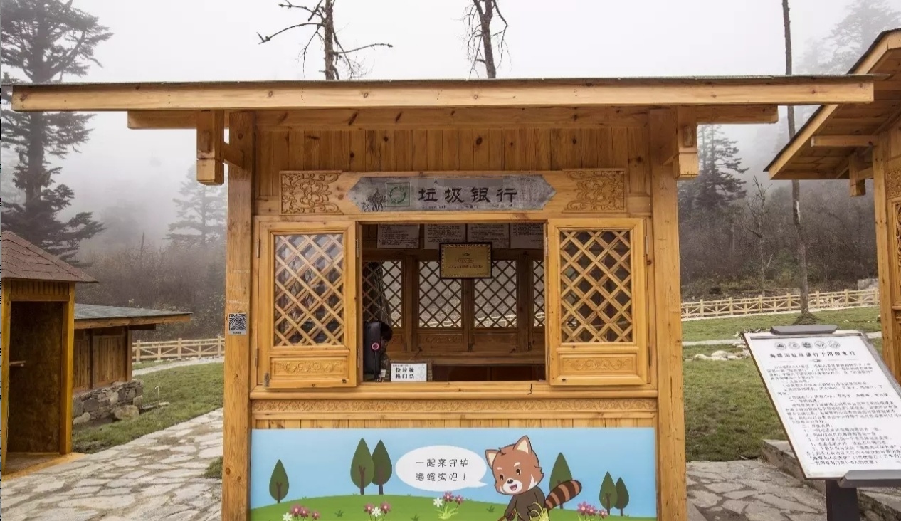 游客一下车,便看见一个挂着“垃圾银行”牌子的小木屋,木屋前不少游客排队向工作人员领取垃圾袋。进入海螺沟的游客都能免费领到一个印有“存垃圾、得信誉、一路风景、携手同行”的清洁袋,这是由海螺沟景区设立的中国首家“垃圾银行”发起的绿色环保行动。
