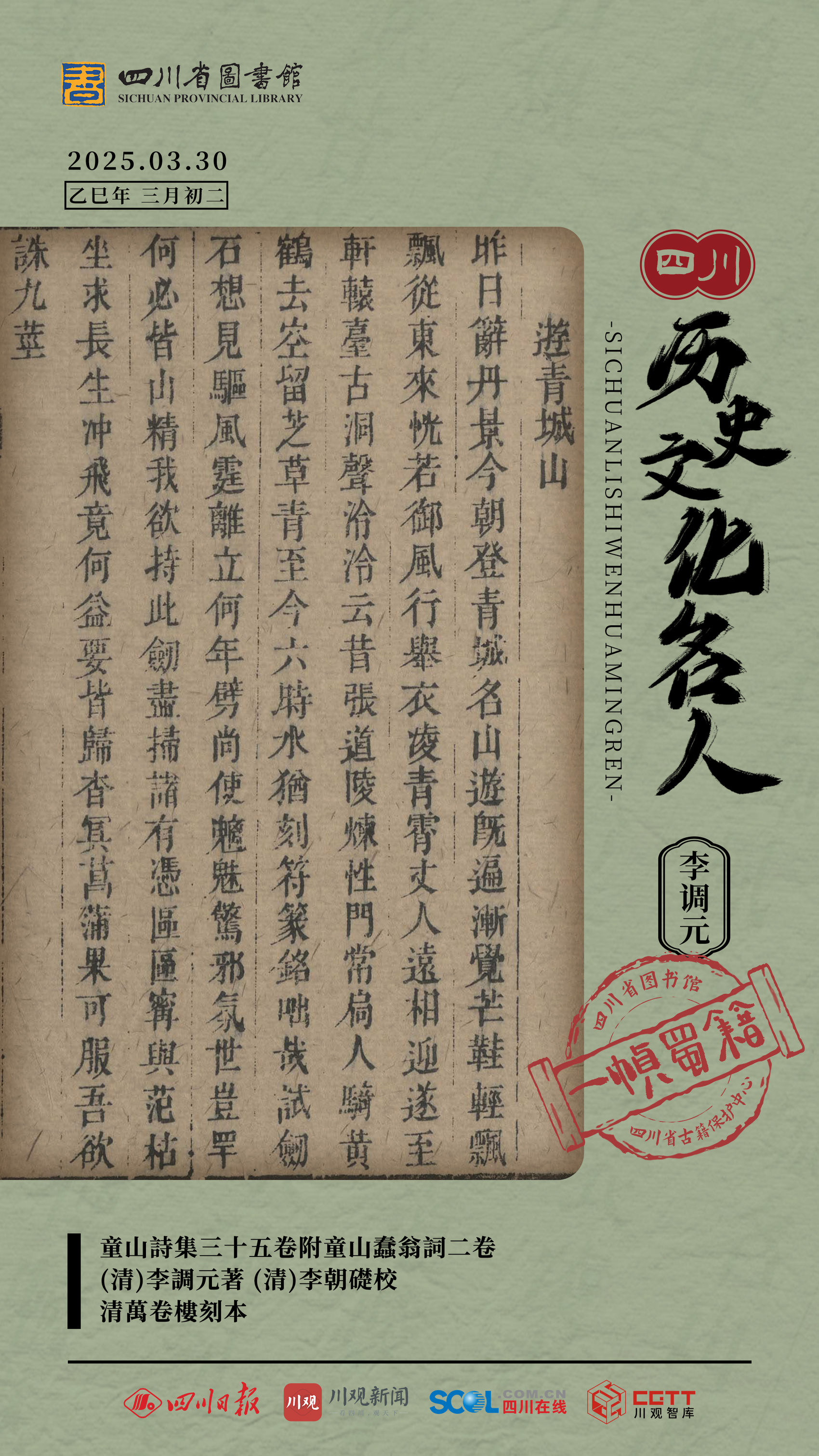 3月30日,一帧蜀籍邀您欣赏《童山诗集》。海报所选用图为《童山诗集》三十五卷附童山蠢翁词二卷。由(清)李调元著(清)李朝础校,版本为清万卷楼刻本。