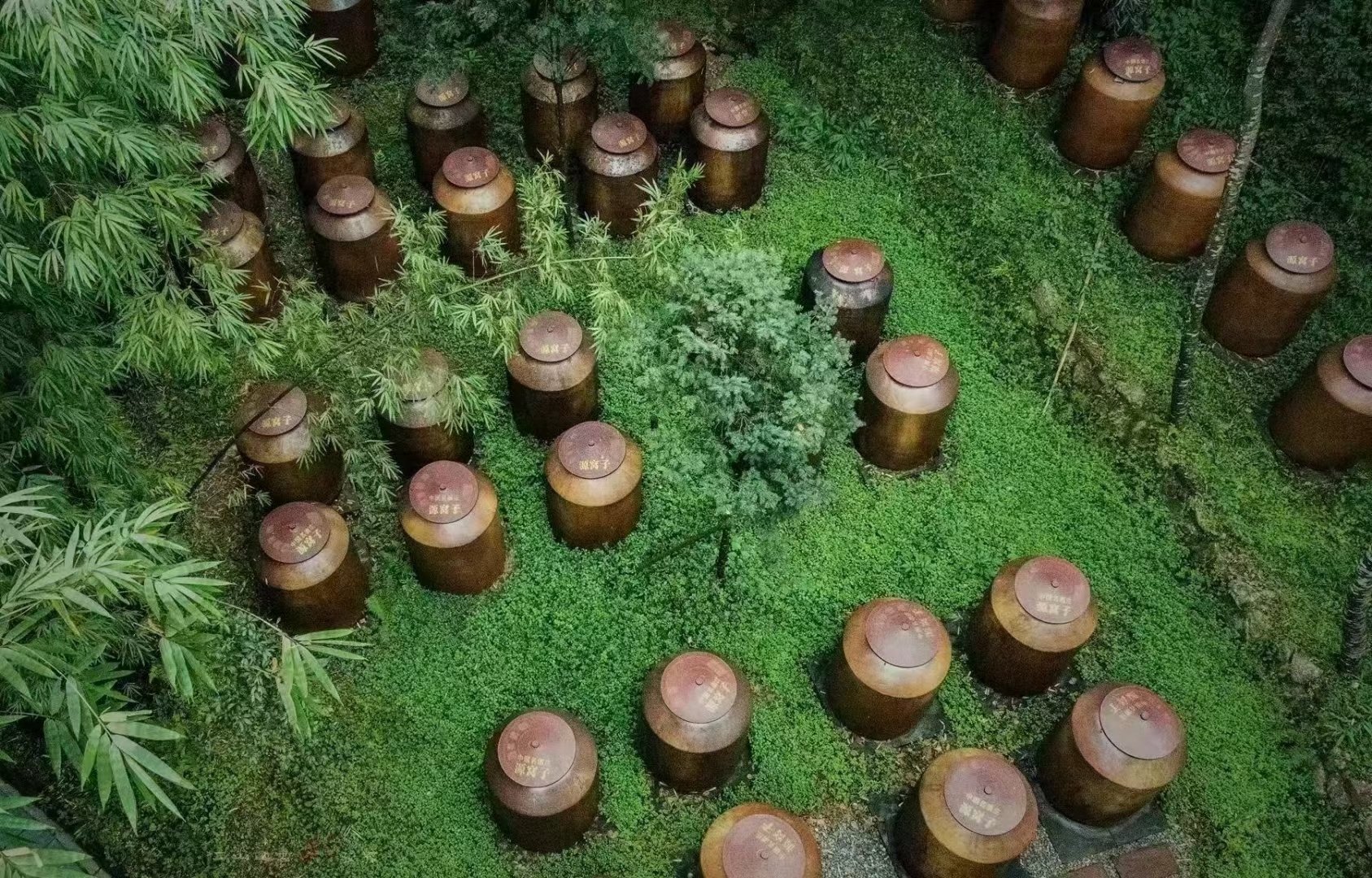 在竹林掩映的源窝子酒庄里,数千个巨大的陶坛静卧于林间,与苍翠竹影相映成趣。源窝子酒庄负责人介绍,占地800亩的酒庄已打造成为集有机原料种植、酿造工艺展示、森林陶坛养酒、中式品鉴、酒文化民宿及养生于一体的综合酒庄。