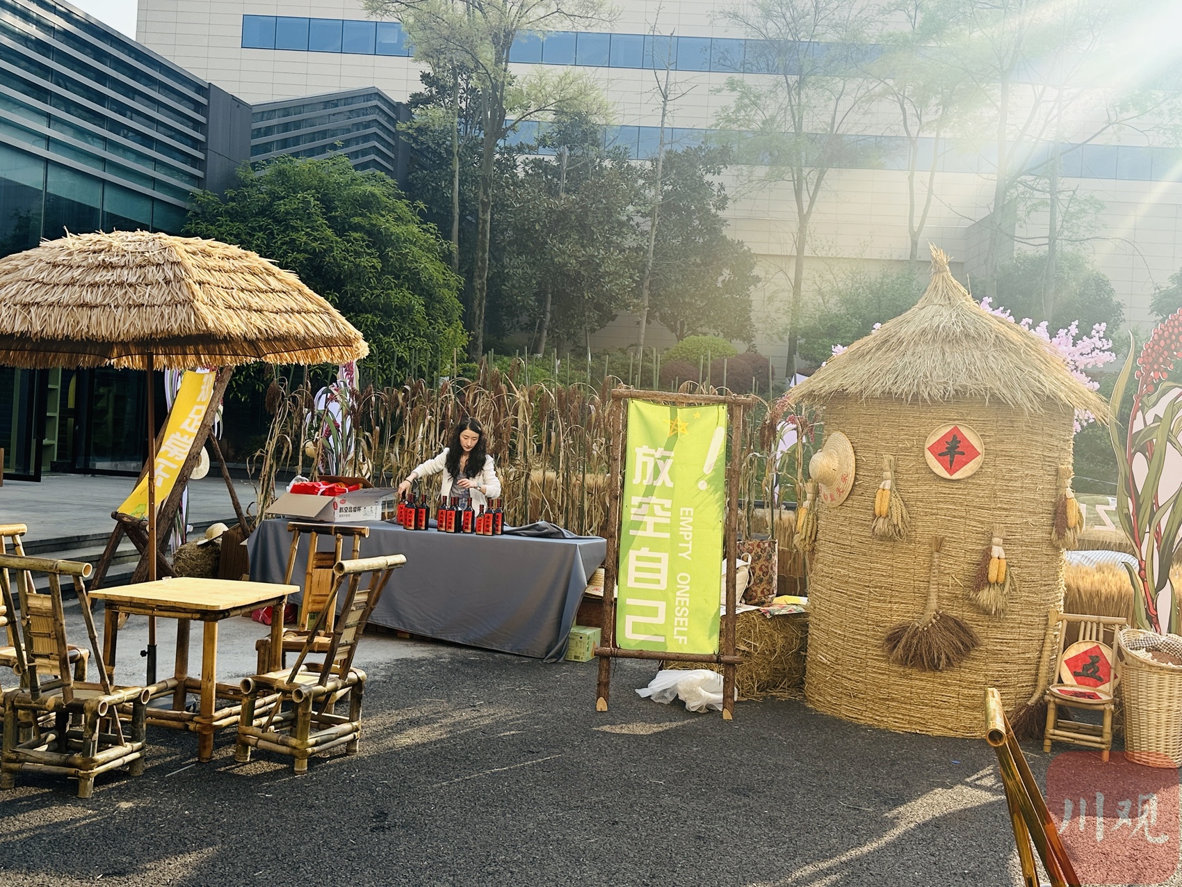 一踏入琼浆悦荟区,以高粱、小麦装点的背景墙映入眼帘,散发着浓郁的乡土气息与酒文化底蕴。沿着台阶向上,茶与酒的创意摊位依次排开,巧妙融合;台阶之下,竹桌竹椅错落有致,供人休憩。