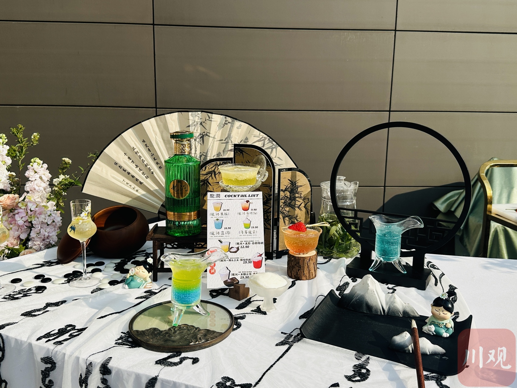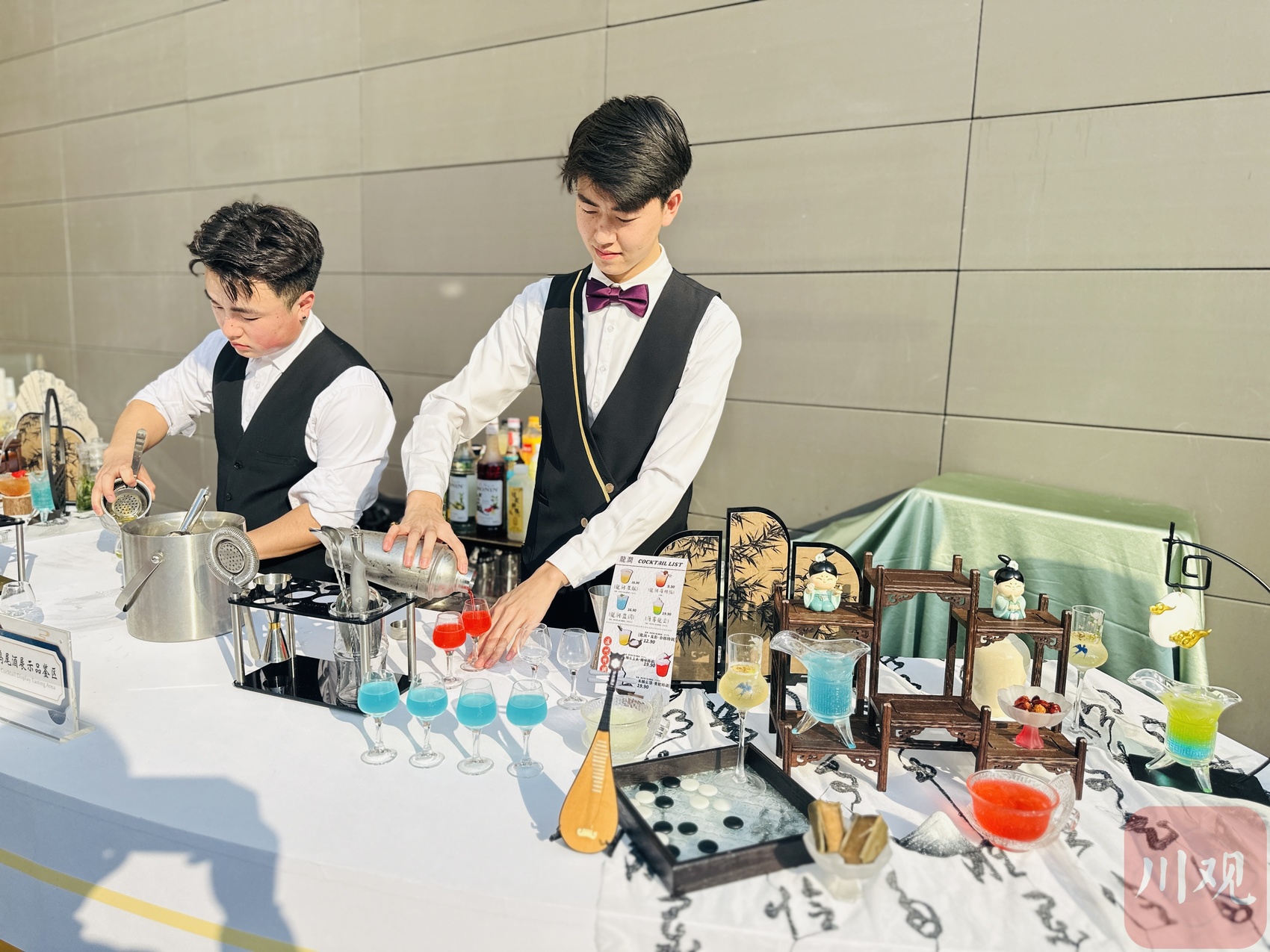 在泸州市职业技术学院的展位前,师生们合力带来了独具特色的“龙涧酒”。“‘龙涧酒’为学院派独创,拥有‘浓香清’三香系列,口感醇厚绵柔 。学生们以此为基酒,创新调制新中式鸡尾酒,涵盖浓香、清香、酱香口味,度数多在5度左右,还贴心推出无酒精款。”校酒店管理与数字化运营专业老师刘红莲介绍道。