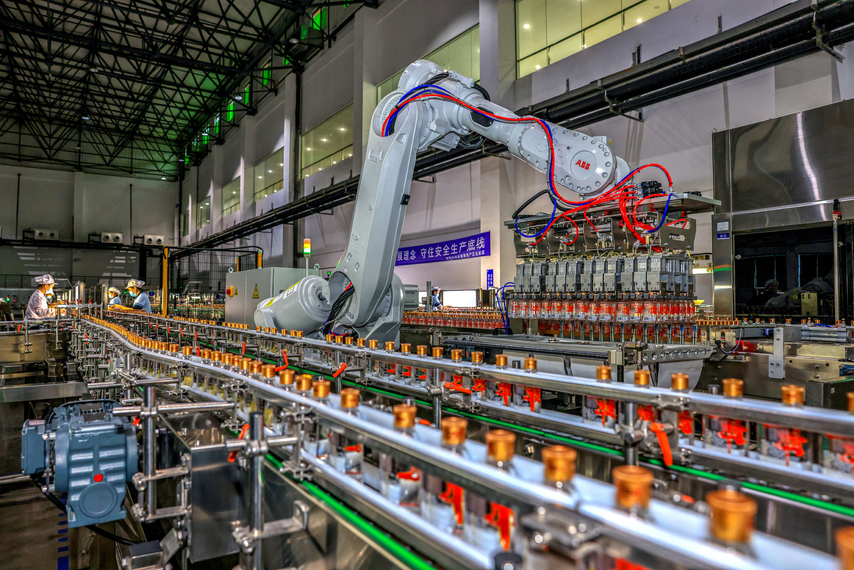 在醉清风酒业股份有限公司智能酿造示范车间,机器人的手臂,可以感知温度,精准撒出粮糟,便是上甄这一酿酒环节中难度最大的部分,也已经被机器人取代。