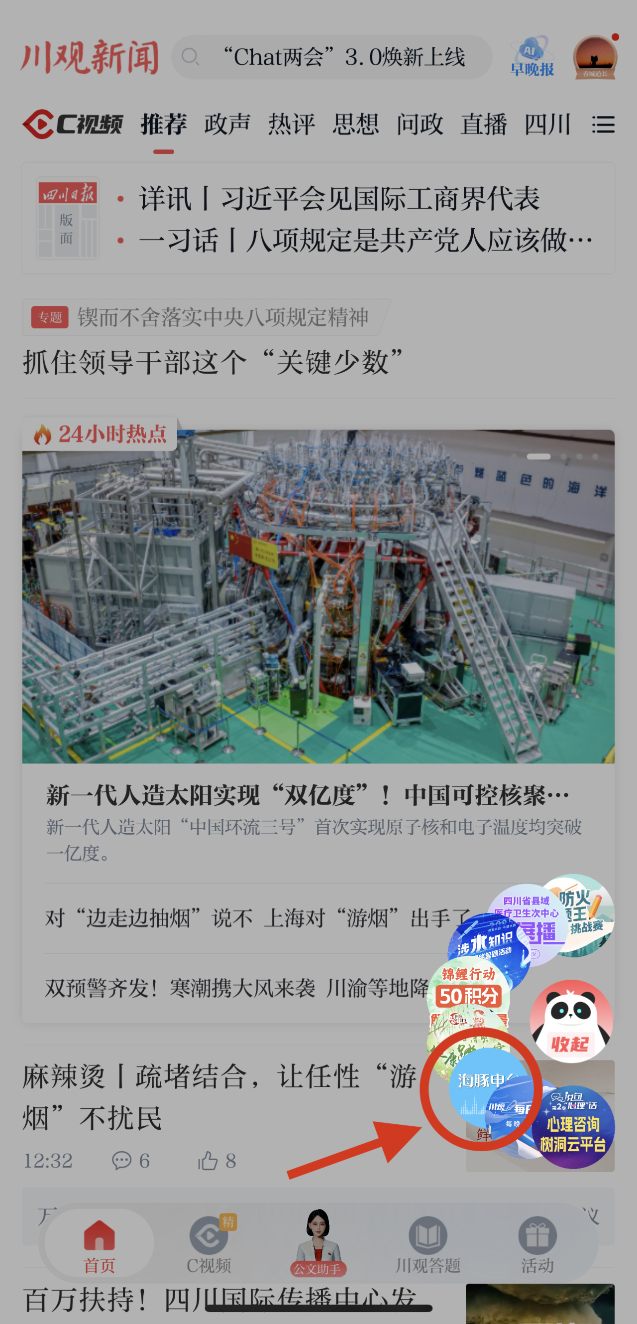 2、在川观新闻首页,点击右下角悬浮球,找到“海豚电台”图标,点击即可进入。