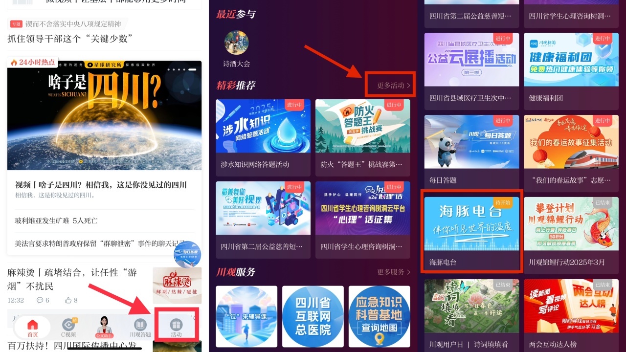 3、或在川观新闻首页,点击右下角“活动”,选择“更多活动”,找到“海豚电台”图标,点击即可进入。