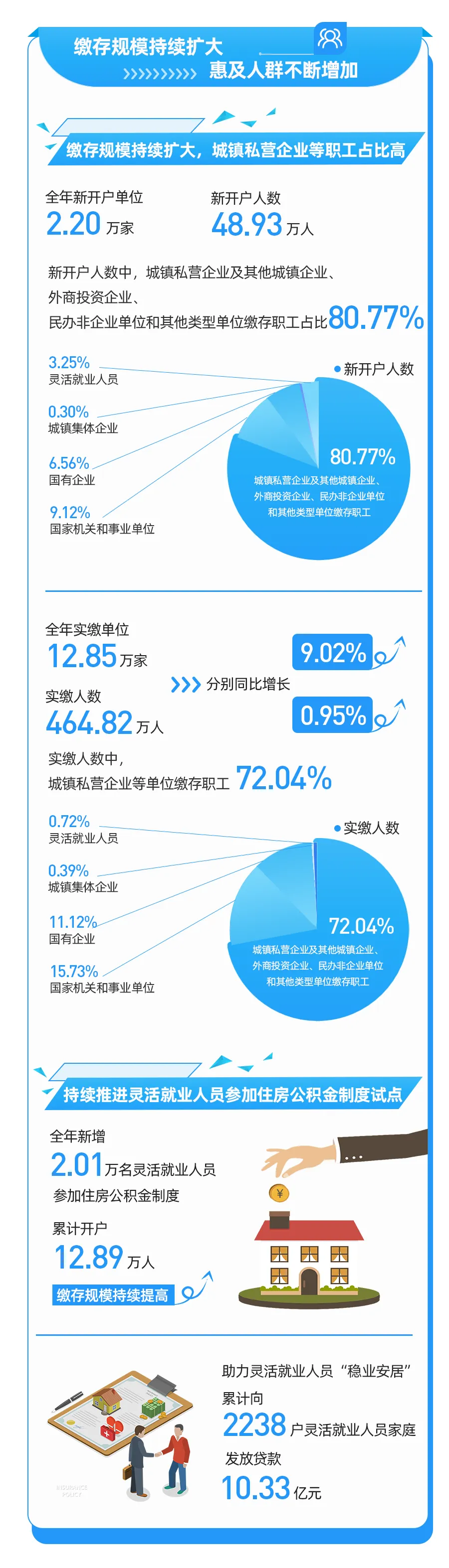 全年新增2.01万名灵活就业人员参加住房公积金制度,累计开户12.89万人,缴存规模持续提高。助力灵活就业人员“稳业安居”,累计向2238户灵活就业人员家庭发放贷款10.33亿元。