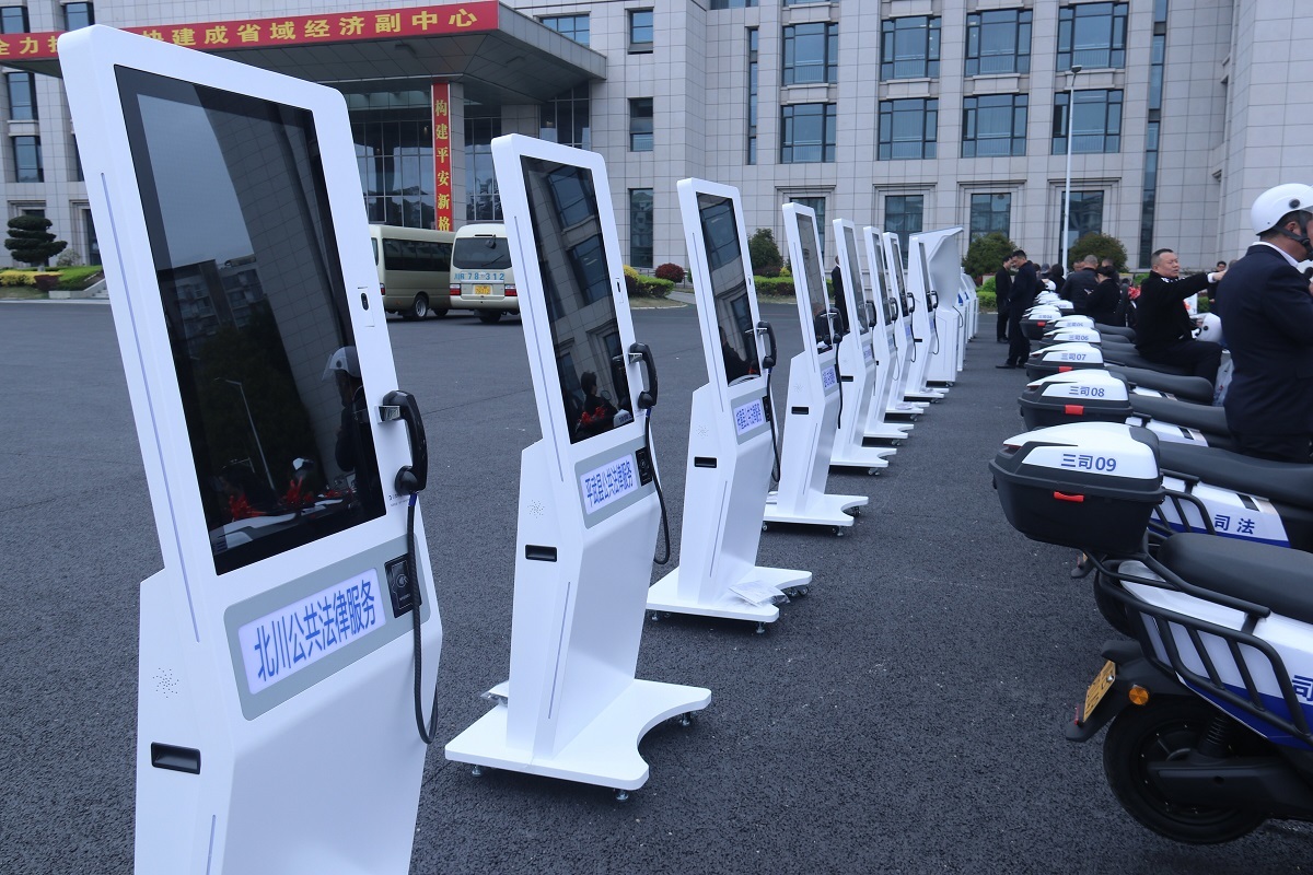 活动现场,向9个县(市、区)司法局发放设备交接凭证,向全市42个中心司法所配发15台公共法律服务一体机,95辆执法执勤电动车。
