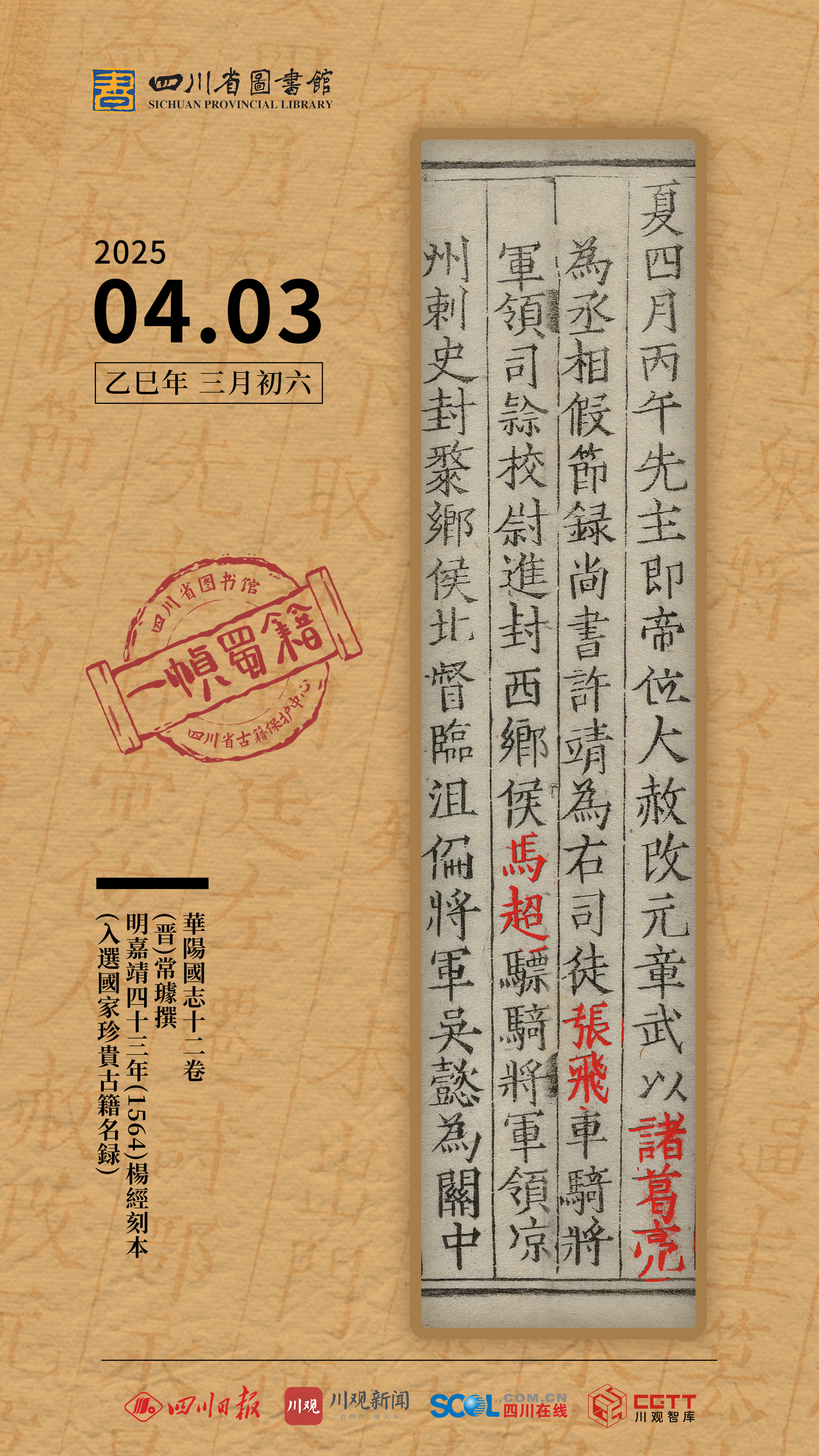 4月3日,一帧蜀籍邀您欣赏《华阳国志》。海报所选用图为《华阳国志》十二卷,由(晋)常璩撰。版本为明嘉靖四十三年(1564)杨经刻本(入选国家珍贵古籍名录)。