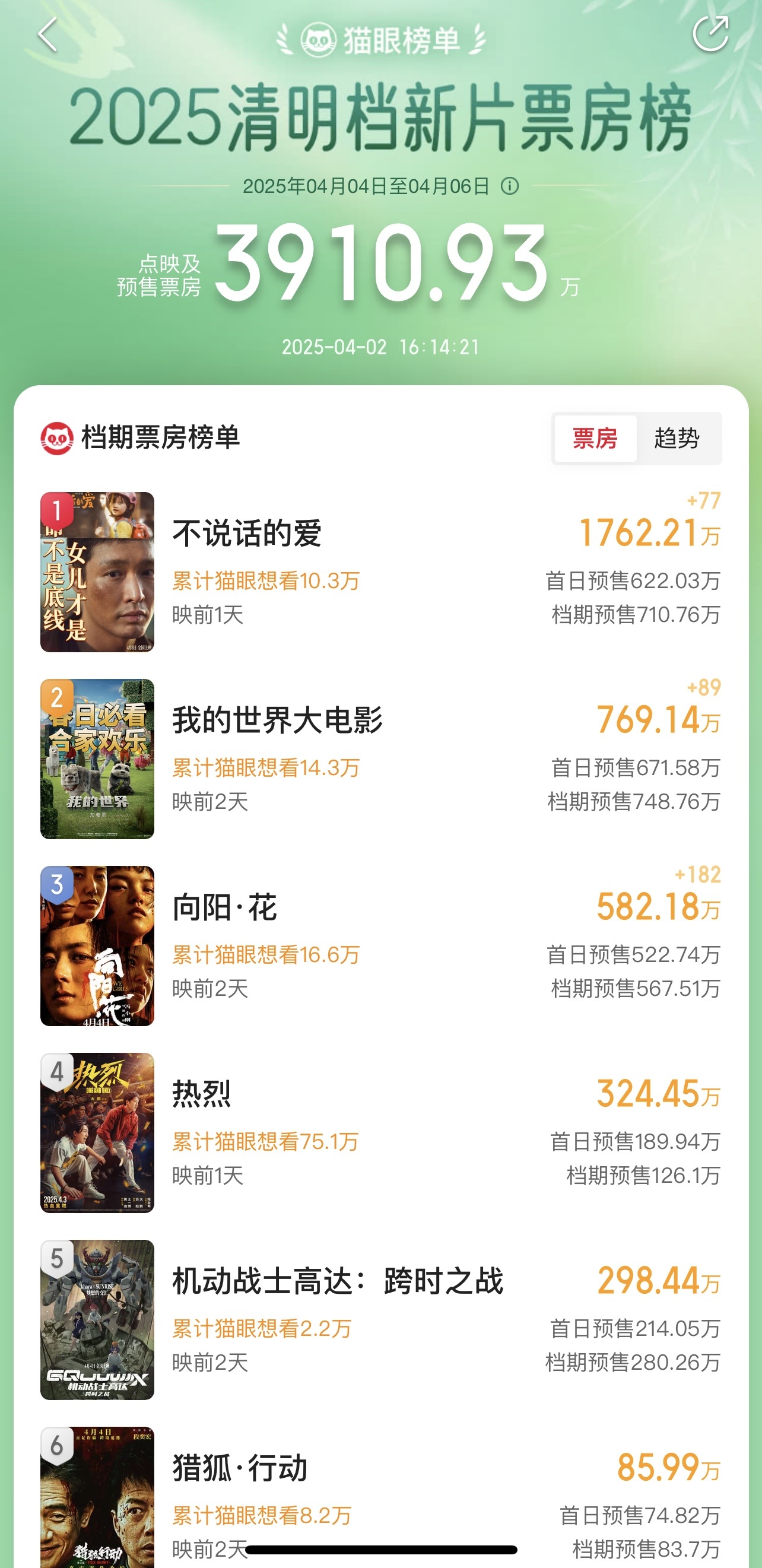 据猫眼专业版数据显示,截至4月2日16时,2025年清明档新片预售总票房超3900万。总体看来,今年清明档总体呈现出影片供给数量充足、题材丰富多元的态势,为受众提供了多样化的观影选择。