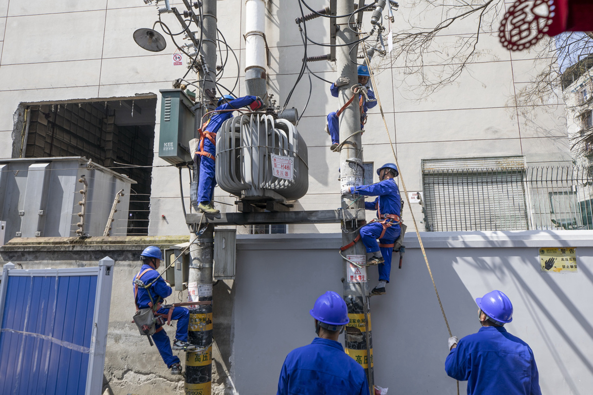 电力工作人员正在开展架空线改造下地工作。陈红梅 摄