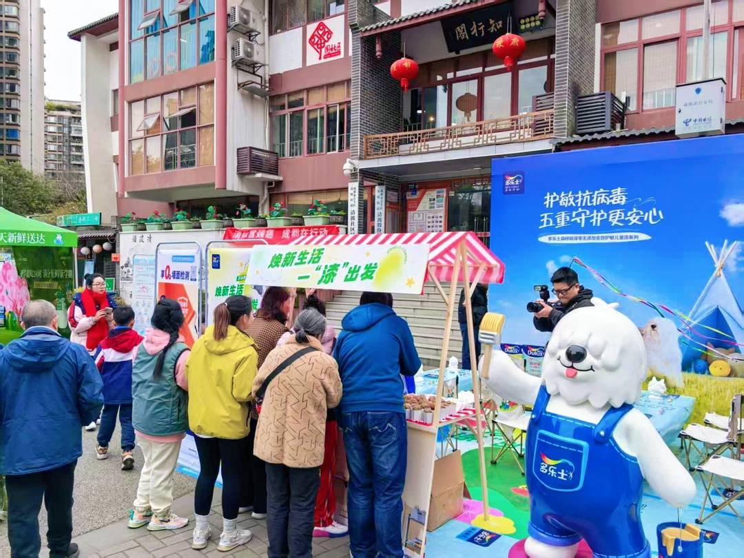 活动现场,极光口腔为居民提供免费血压测量、口腔健康咨询及扫码领牙膏服务,吸引了众多中老年人参与。新希望华西乳业通过鲜牛奶试饮、萌趣人偶互动和扫码赠礼,传递健康饮食理念。为了让居民更直观地了解多乐士的环保产品与服务,多乐士特别设计了互动展位,通过场景化展示、专业讲解和趣味体验,让居民近距离感受焕新服务。