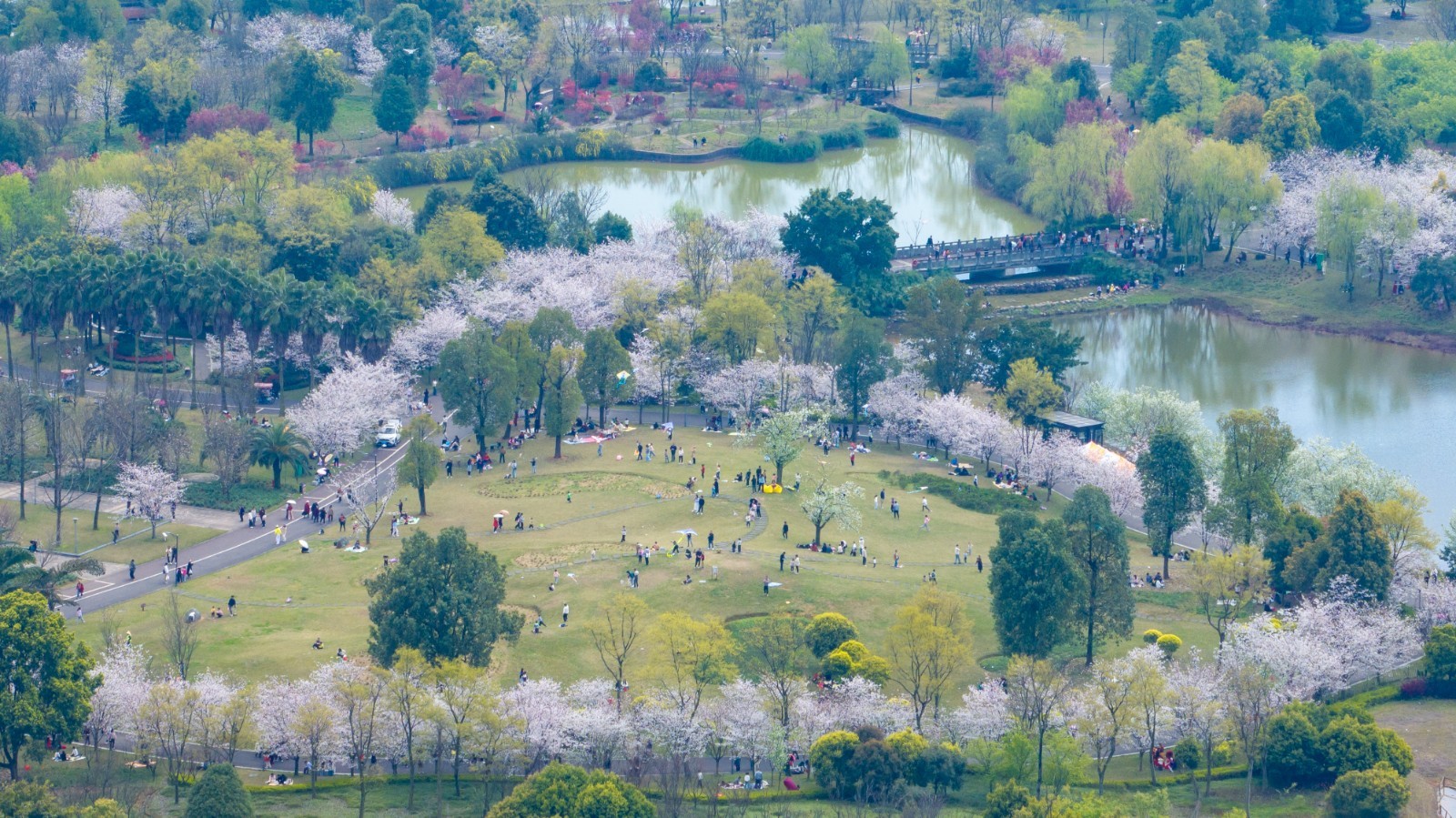 移步文创园,樱云正为现代建筑蒙上古典滤镜。无人机掠过时,可见樱花遍地与游人如织的奇妙叠影,似一幅未干的水墨长卷。飘落露天展馆的瓣雨,恰似拓印而来的立体诗行。