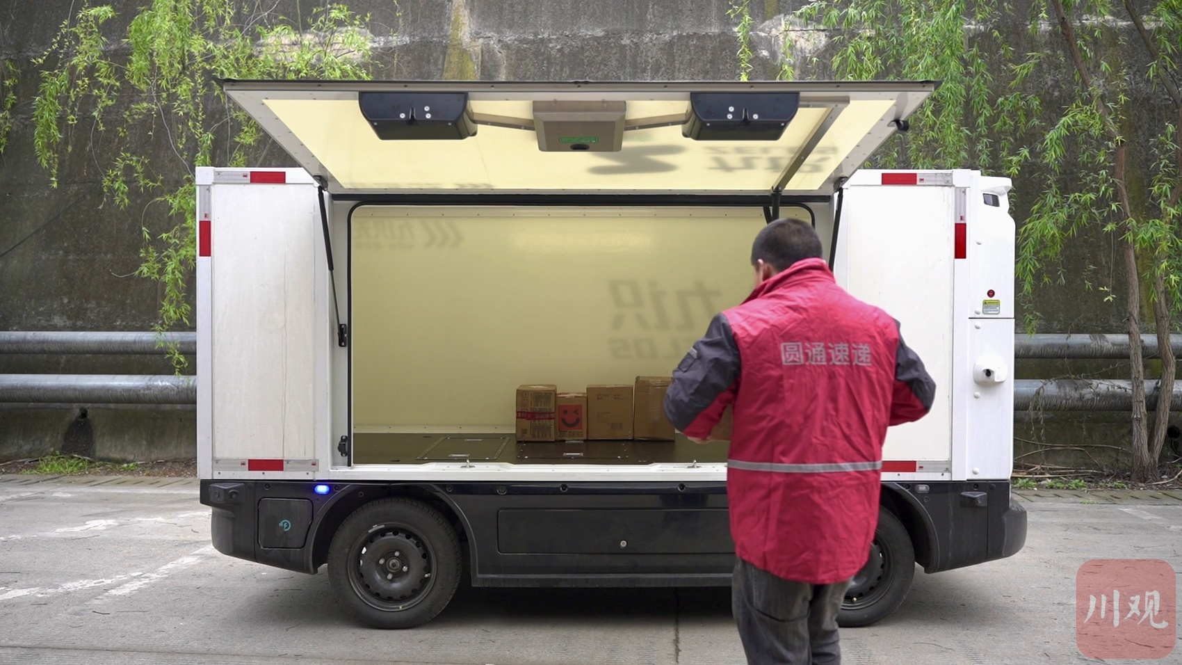 “手机扫码后,在控制程序上选好站点、路线,车辆就会按路线送货,我们也能随时看到车辆情况。”杨波介绍,这辆无人配送车最大载货容积5立方米,一般能装载600多件快递。车辆采用新能源动力,满载状态下续航里程可达130公里,时速最高40公里。