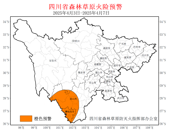 4月3日,记者从应急管理厅获悉,经省森防指办公室与省林草局、四川气象局及相关地方会商研判,结合气象条件、林区物候、人为活动、野外火源及历史火灾发生情况,预计4月3日至7日,攀枝花市、凉山州西部和中部(涉及11个县级行政单位)森林草原火险等级将维持在高度危险级别,省森防指办公室特发布高森林草原火险橙色预警。