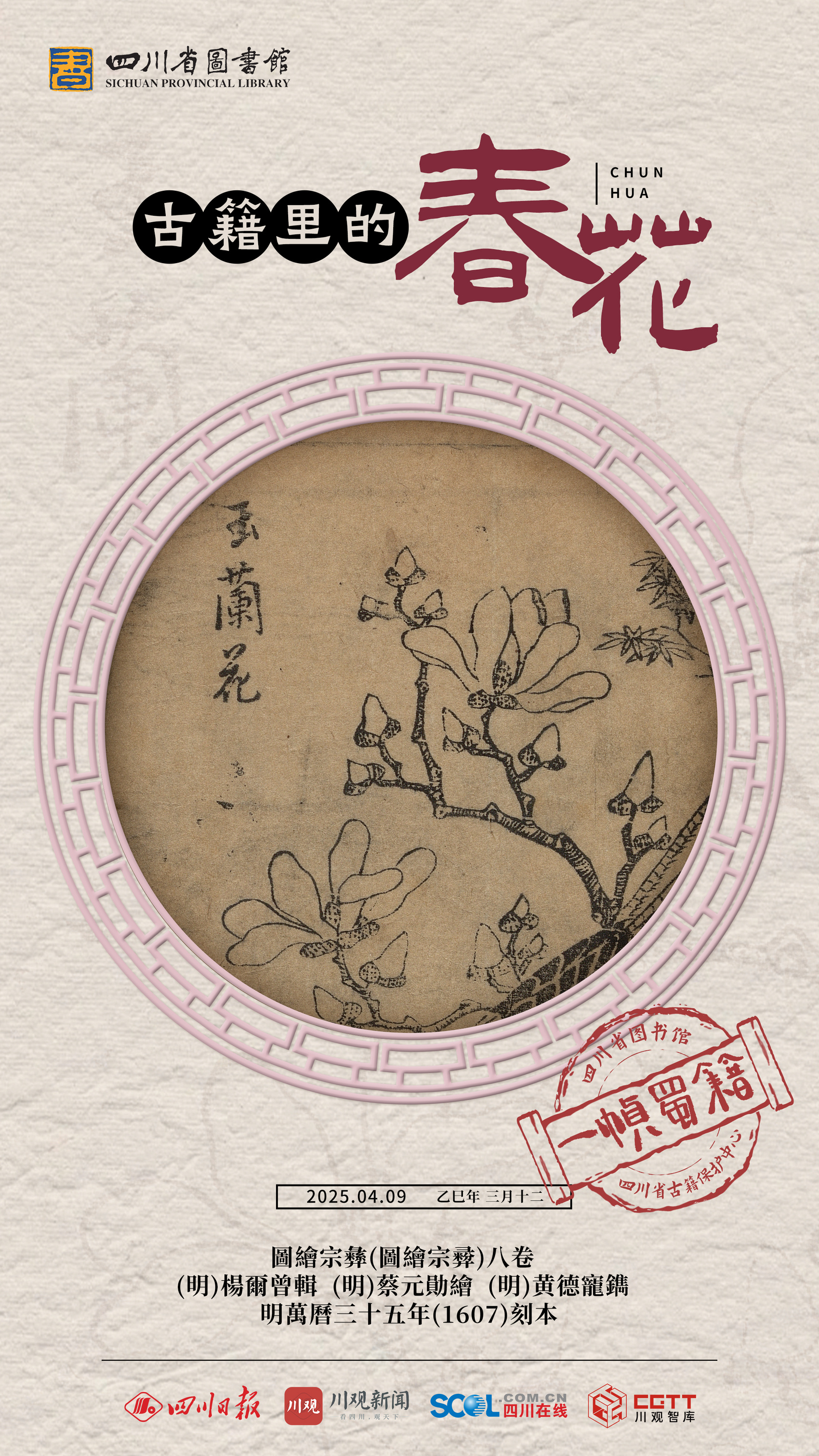 4月9日,一帧蜀籍邀您欣赏《图绘宗彝》。海报所选用图为《图绘宗彝》(图绘宗彛)八卷,由(明)杨尔曾辑、(明)蔡元勋绘、(明)黄德宠镌。版本为明万历三十五年(1607)刻本。
