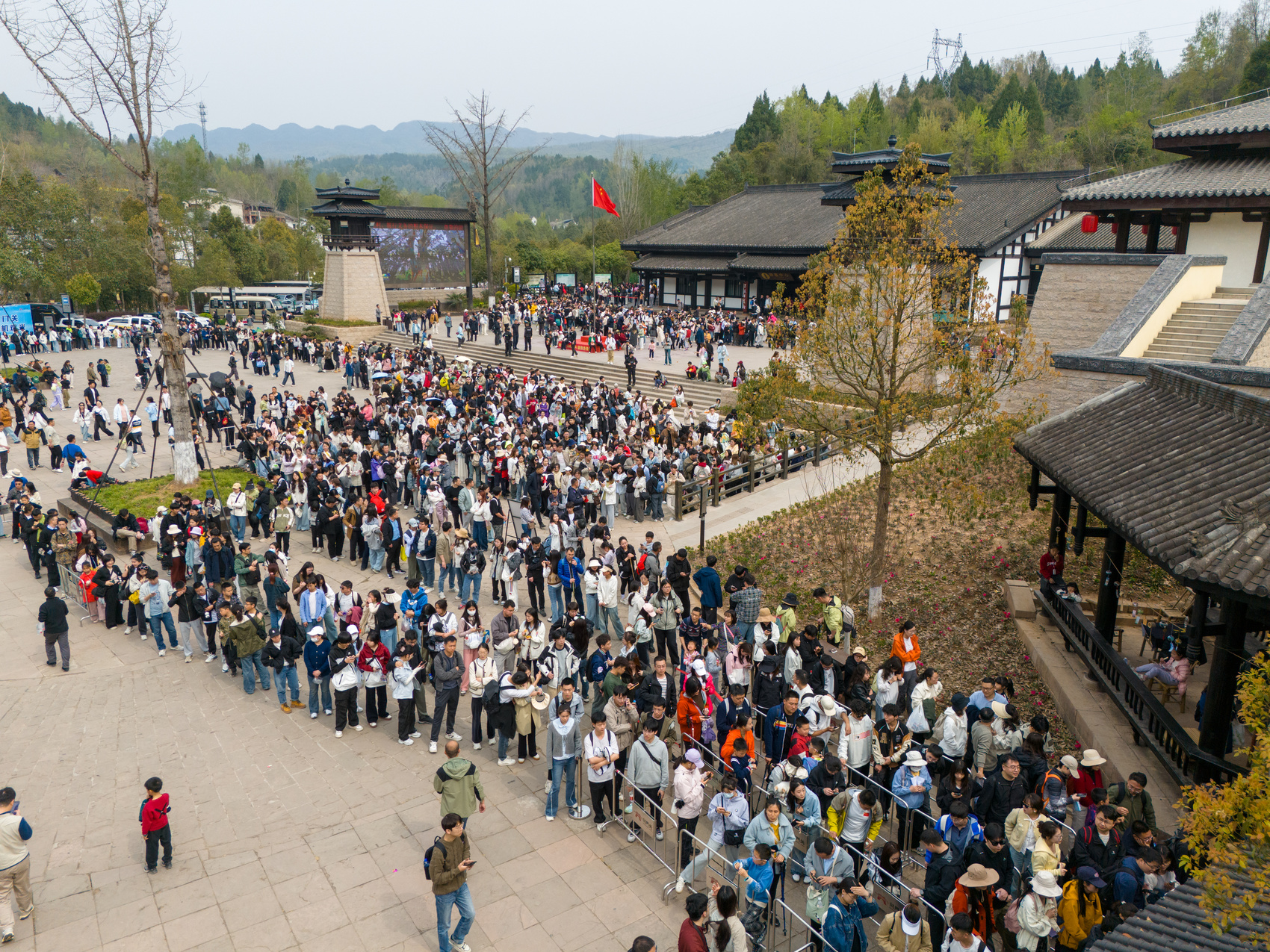 4月5日,剑门关景区一大早就忙了起来,持续迎来高峰。尤其是在游客中心,游客们排起长队共诵《蜀道难》,场面十分壮观。