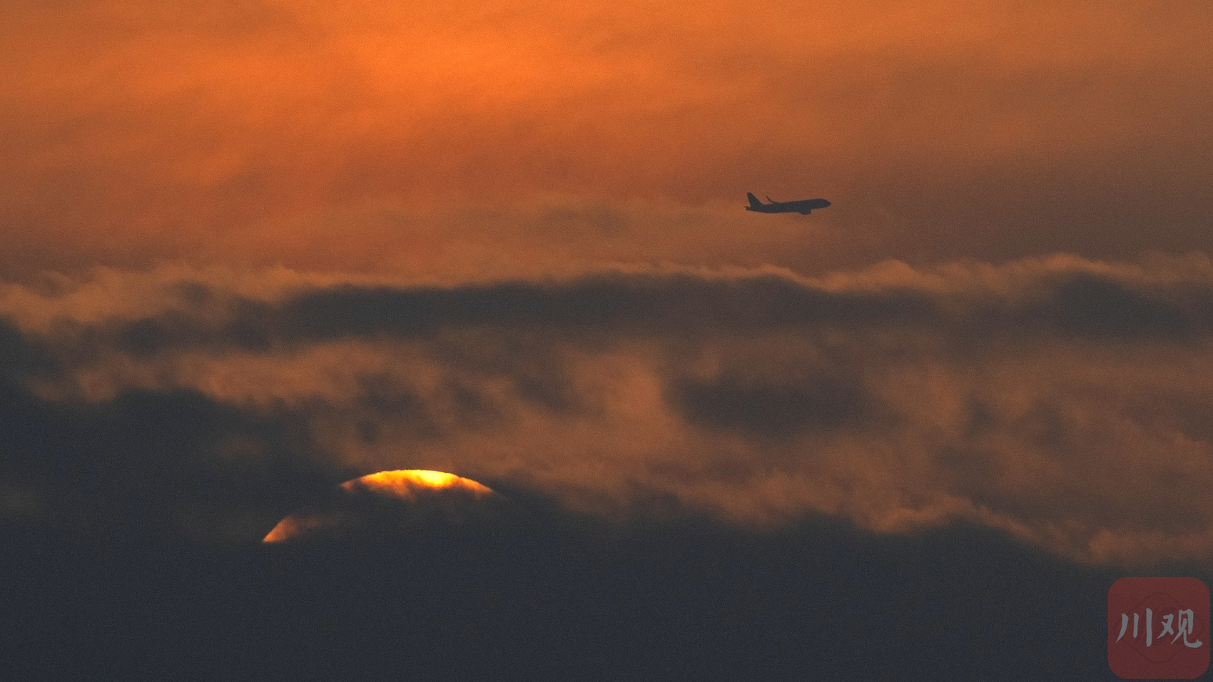 4月6日傍晚,美丽的夕阳出现在成都西面,前往双流国际机场的航班在暮光中穿过市区向南降落,光影美轮美奂。