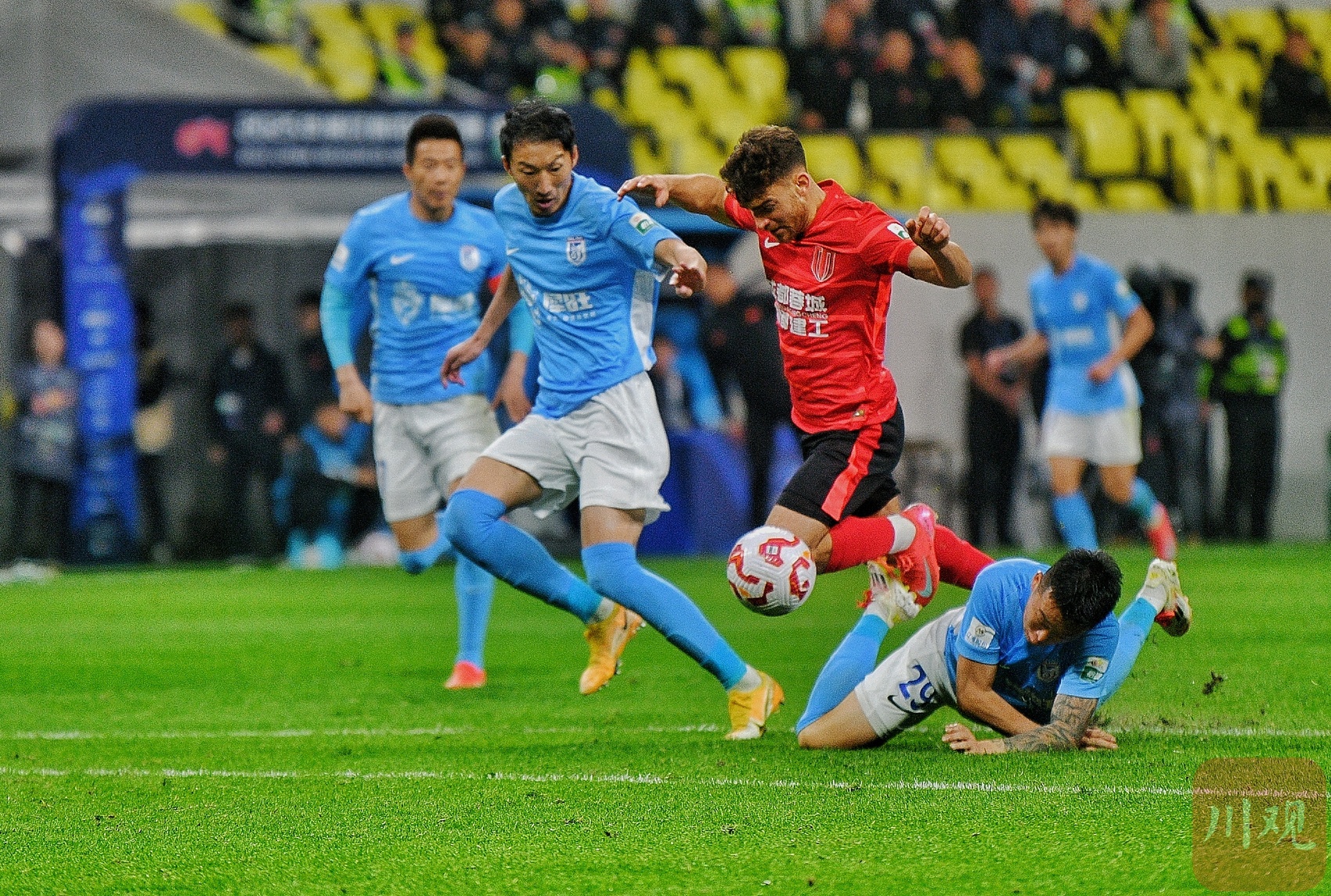成都蓉城队员(红衣)在对方禁区内大举进攻。