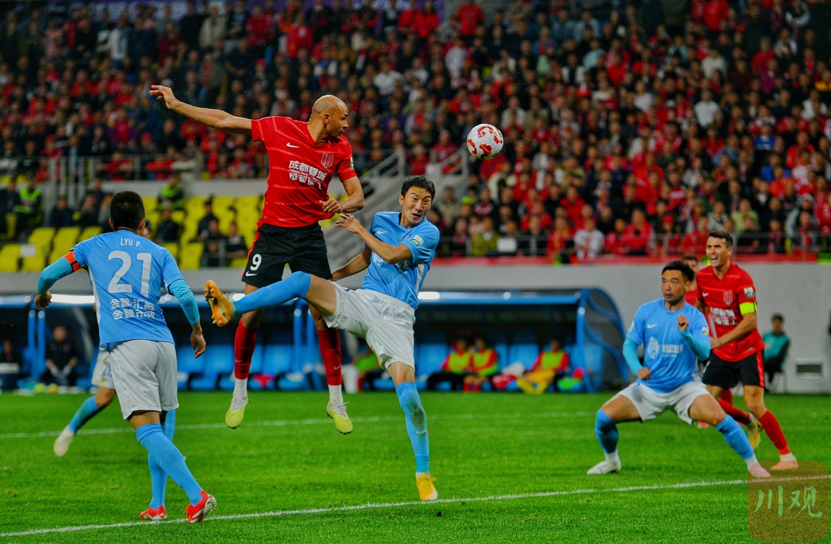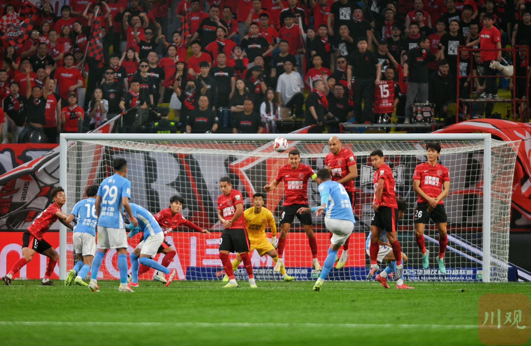成都蓉城队员胡荷韬(红衣)攻门瞬间。