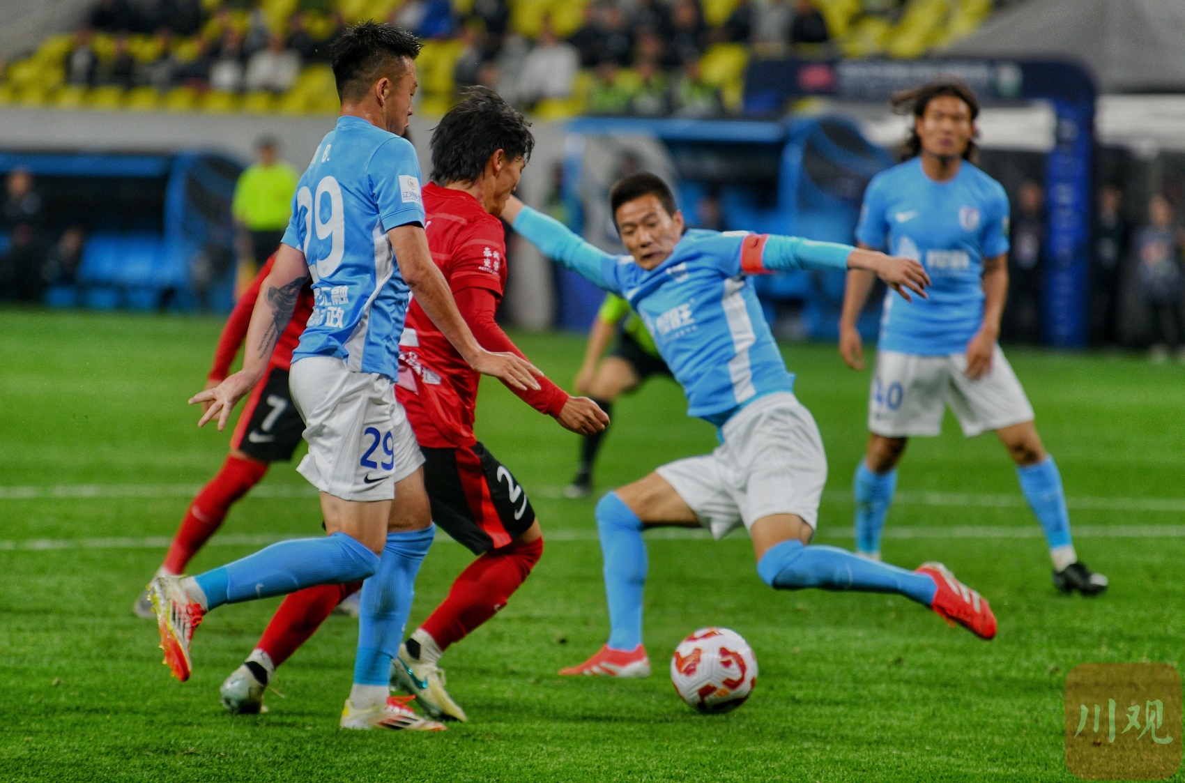 成都蓉城队员(红衣)在防守大连英博的进攻。