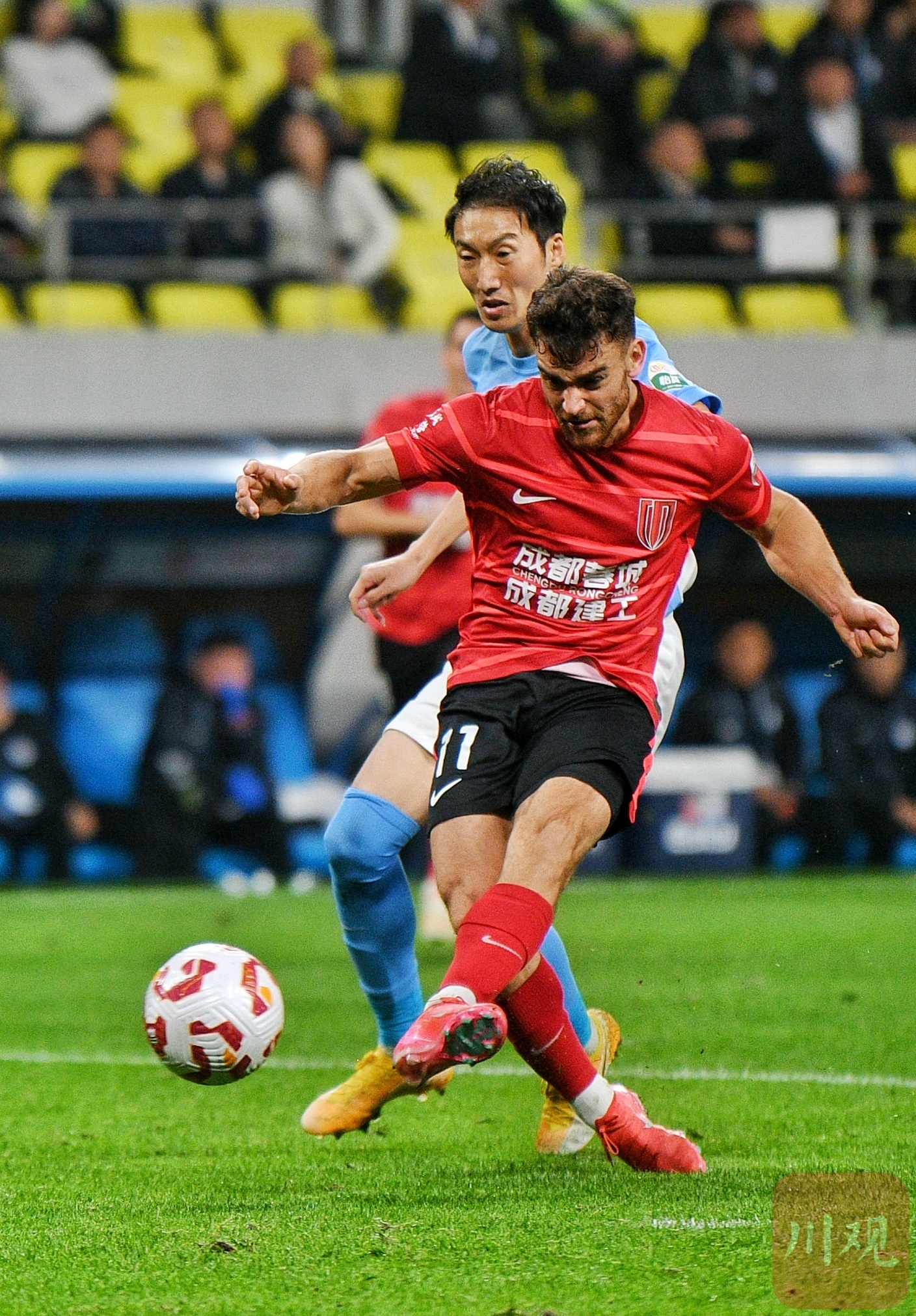 成都蓉城队员11号冷静攻门瞬间。