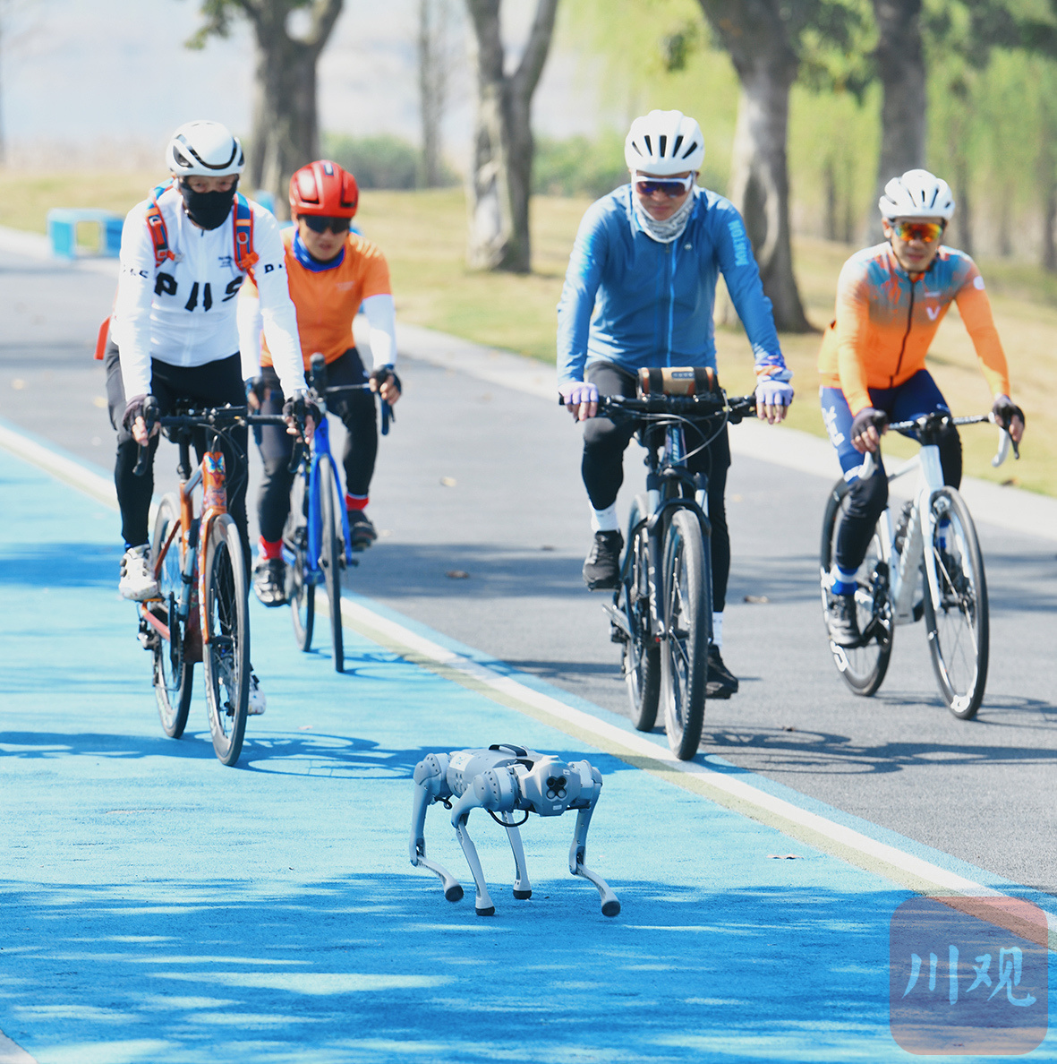 3月26日清晨,骑行爱好者与Unitree Go1四足机器人在成都兴隆湖畔共享绿道。