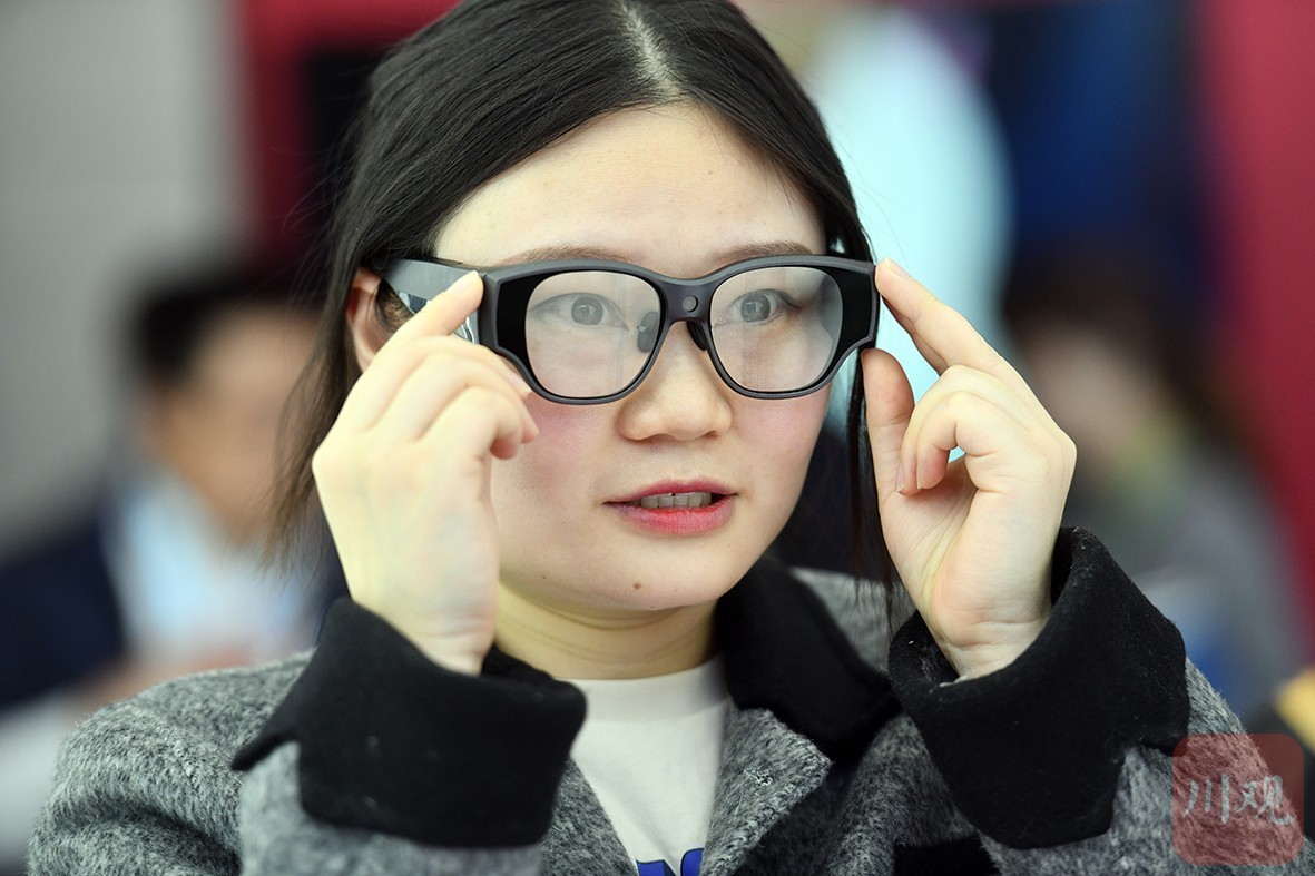 3月27日,第十二届中国网络视听大会新技术与精品内容体验展现场,参会人员正在体验全球首款1080P分辨率AR智能眼镜。