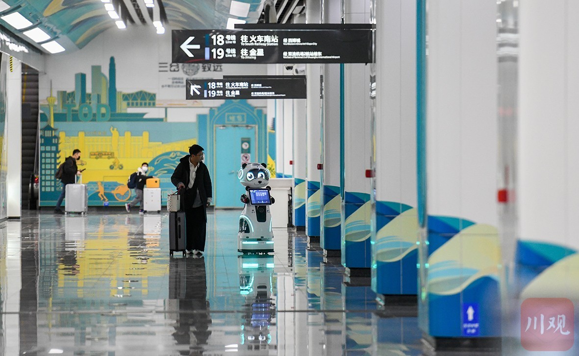 除了四足机器人,更多智能设备已融入成都的街头巷尾。在成都市三岔地铁站换乘大厅,圆润可爱的“小电”智能机器人已服务乘客半年之久。这款由成都地铁打造的导览机器人,融合了本土文化元素,具备智能问询、视频宣传、音乐互动等功能,成为城市智慧出行的新名片。