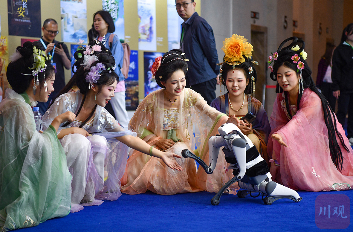 3月27日,第十二届中国网络视听大会新技术与精品内容体验展现场,汉服爱好者们正通过手势与智能机器狗互动。