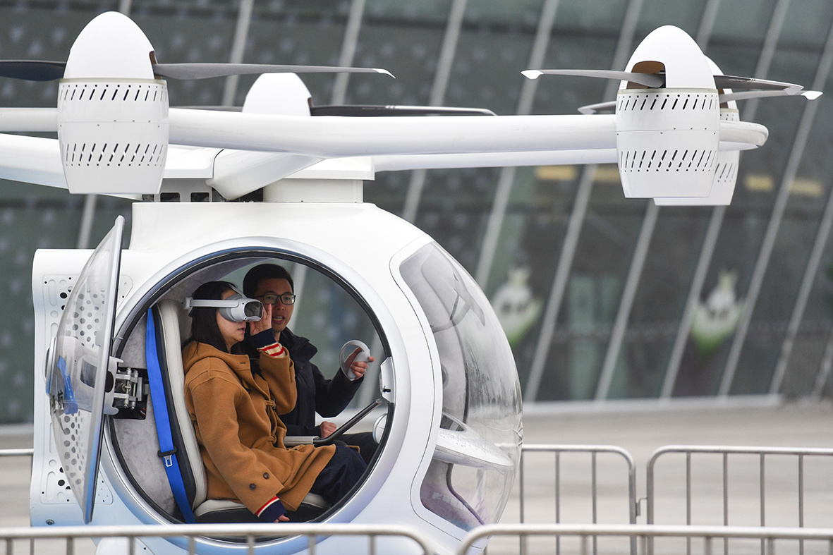 3月28日,成都市民在成都世博园1号门广场体验eVTOL(电动垂直起降飞行器)航空器。