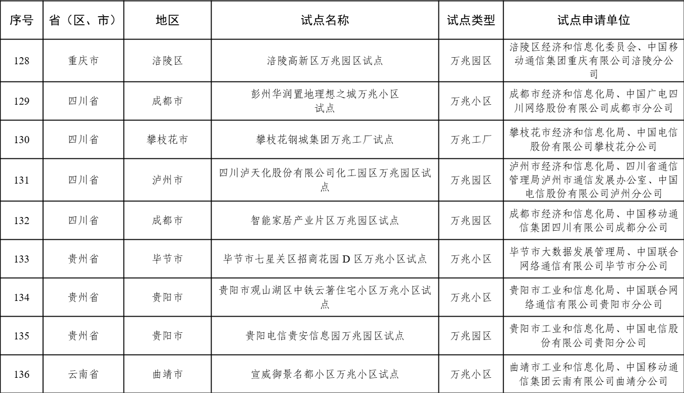 四川省4个点位入围试点名单。其中2个为园区,1个为工厂,1个为小区,分别是:彭州华润置地理想之城万兆小区、攀枝花钢城集团万兆工厂、四川泸天化股份有限公司化工园区万兆园区、成都智能家居产业片区万兆园区。
