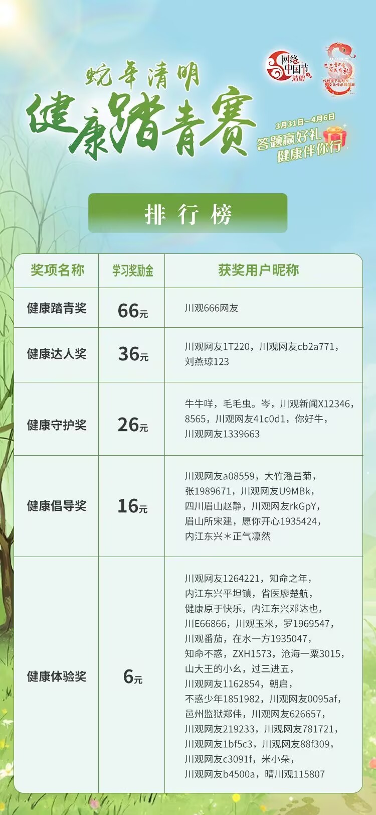 PS,已获得“蛇年新春传统文化争霸赛”“蛇年元宵灯谜挑战赛”排名奖的用户,不参与本次“蛇年清明健康挑战赛”排名。本次活动积分按比例计入2025年“网络中国节”“巳巳如意闯关有礼”活动总排行榜。待今年重阳节活动结束后,将对总排行榜排位靠前的用户作出奖励。