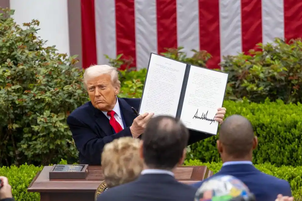 4月2日,美国总统特朗普在华盛顿白宫展示签署后的关于所谓“对等关税”的行政令。新华社记者 胡友松 摄