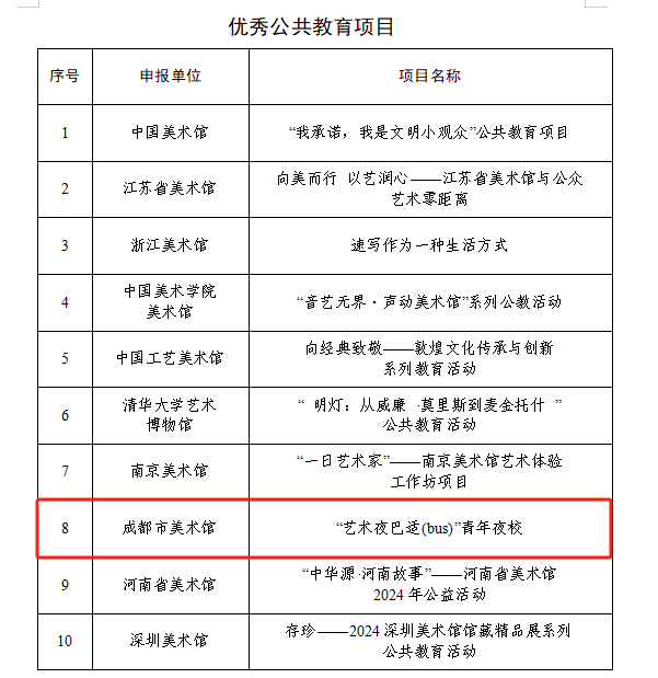 记者4月8日从成都市美术馆获悉,2024年度全国美术馆优秀项目评选入选名单通过公示,由成都市美术馆申报的“艺术夜巴适(bus)青年夜校”成为10个“优秀公共教育项目”之一,也是该类别西部地区唯一入选项目。
