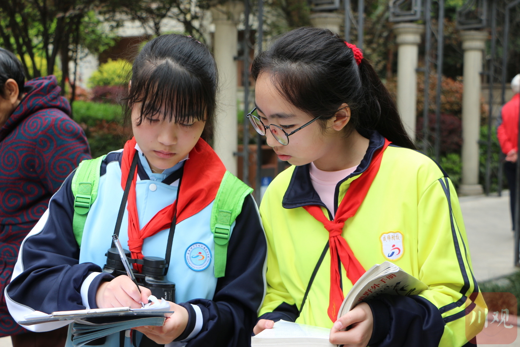 成都师范学院附属实验学校学生科考队的队员们记录鸟的种类和习性。