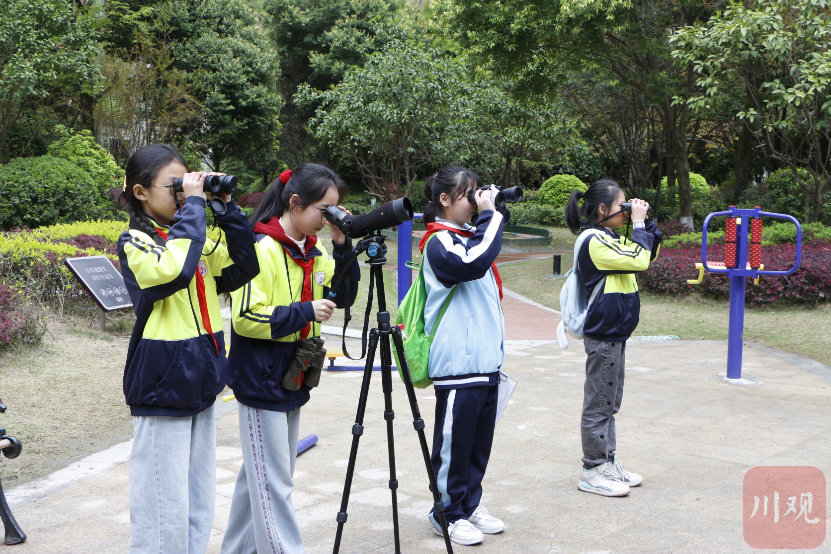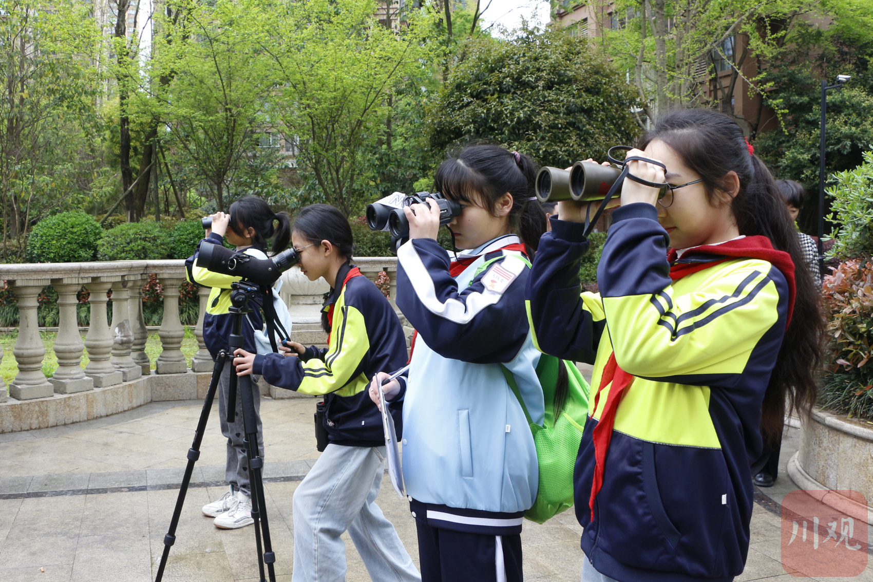 成都师范学院附属实验学校学生科考队在比赛中观鸟。
