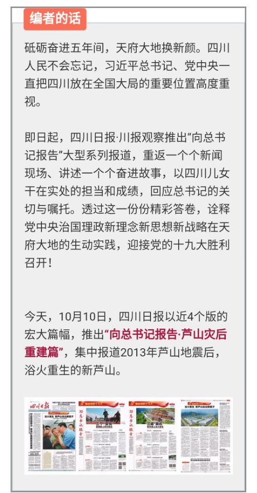 先请赏读第一版刊发的长篇通讯《浴火重生 新芦山走出新路子》的精华摘要,原文作者是四川日报·川报观察记者张守帅、王飞——