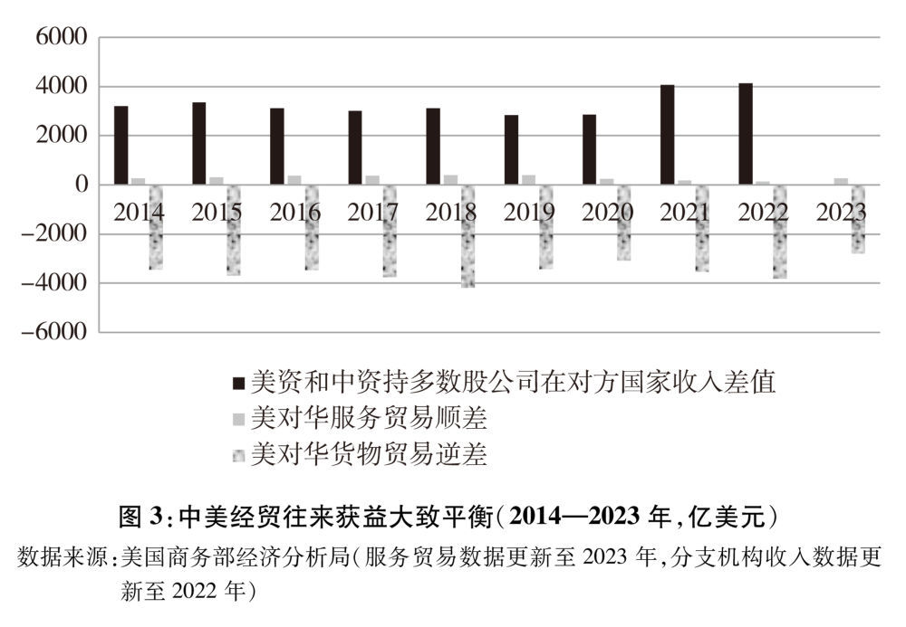 中美经贸合作为美国企业创造了大量商机和利润(表3)。中国拥有庞大的市场和不断升级的消费需求,例如,特斯拉在中国销量持续增长,2024年销量超过65.7万辆,同比增长8.8%,创下历史最高水平。十余家美资保险公司在华设有分公司。高盛、运通、美国银行、美国大都会人寿等美国金融机构作为中国金融机构的战略投资者,均取得了不菲的投资收益。美国商务部2024年8月的统计显示,2022年美国在华企业(拥有多数股权且资产、销售或净收入2500万美元以上)共1961家,总销售额4905.2亿美元,同比增长4.3%。