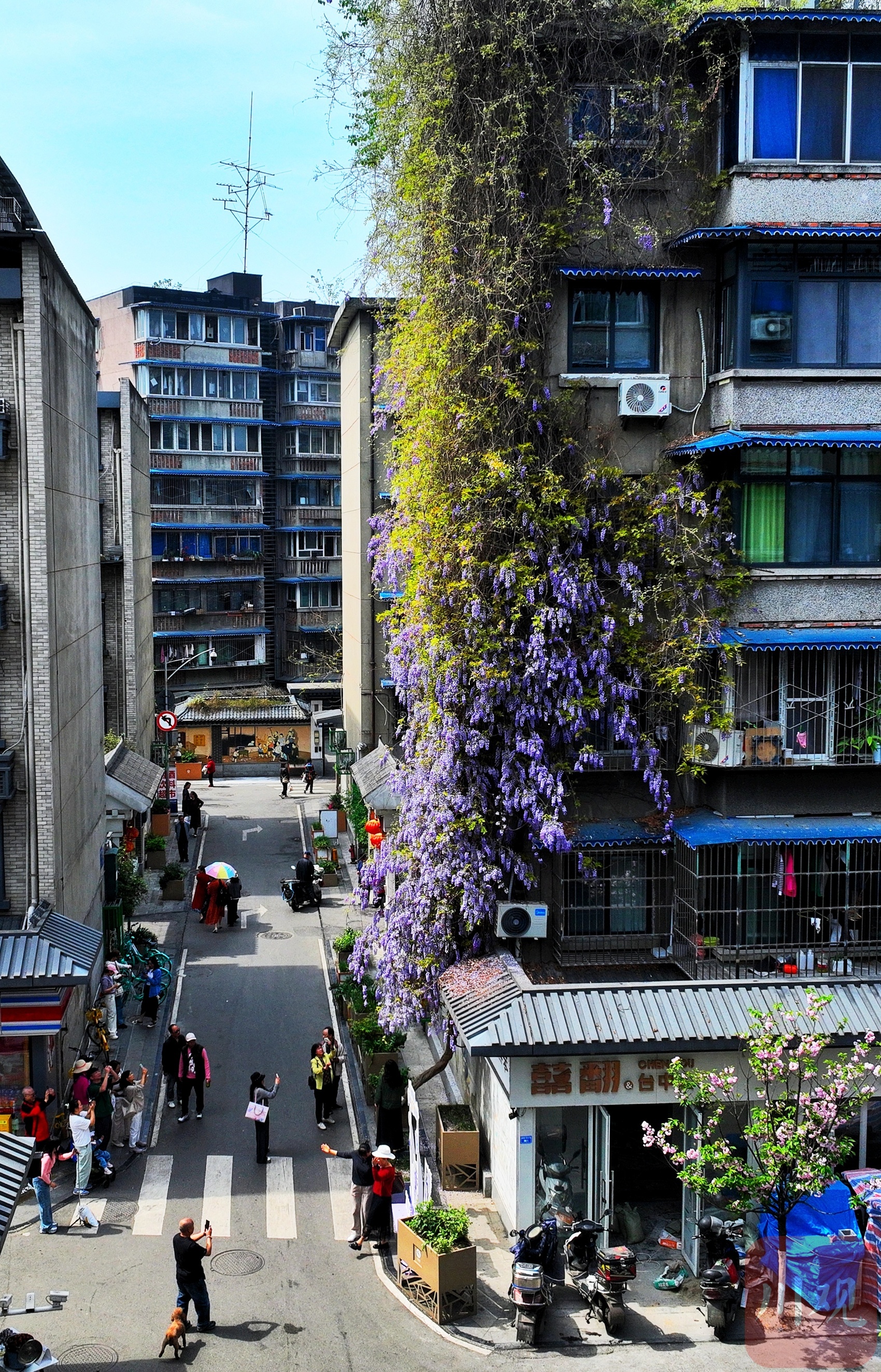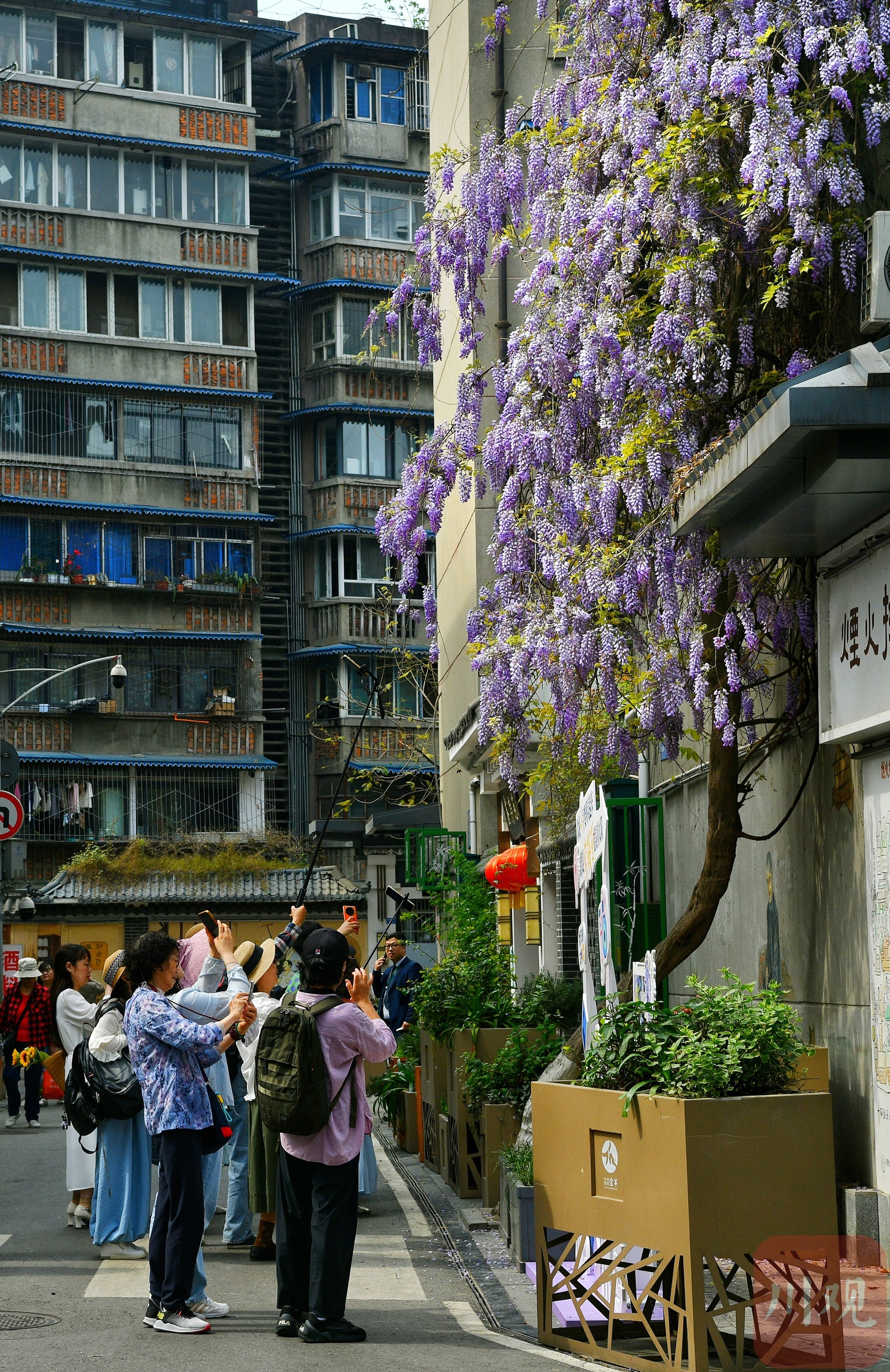 四月芬芳,万木逢春。在成都金牛区抚琴街南一巷,一株“高龄”紫藤在春日暖阳下已悄然苏醒。4月9日上午,记者走出地铁5号线就看到扑面而来的鲜艳紫色,瀑布般的紫藤从一栋6层老居民楼上倾泻而下。这里不仅是本地人感知春意的“晴雨表”,更成为外地游客前往打卡的“网红地标”。