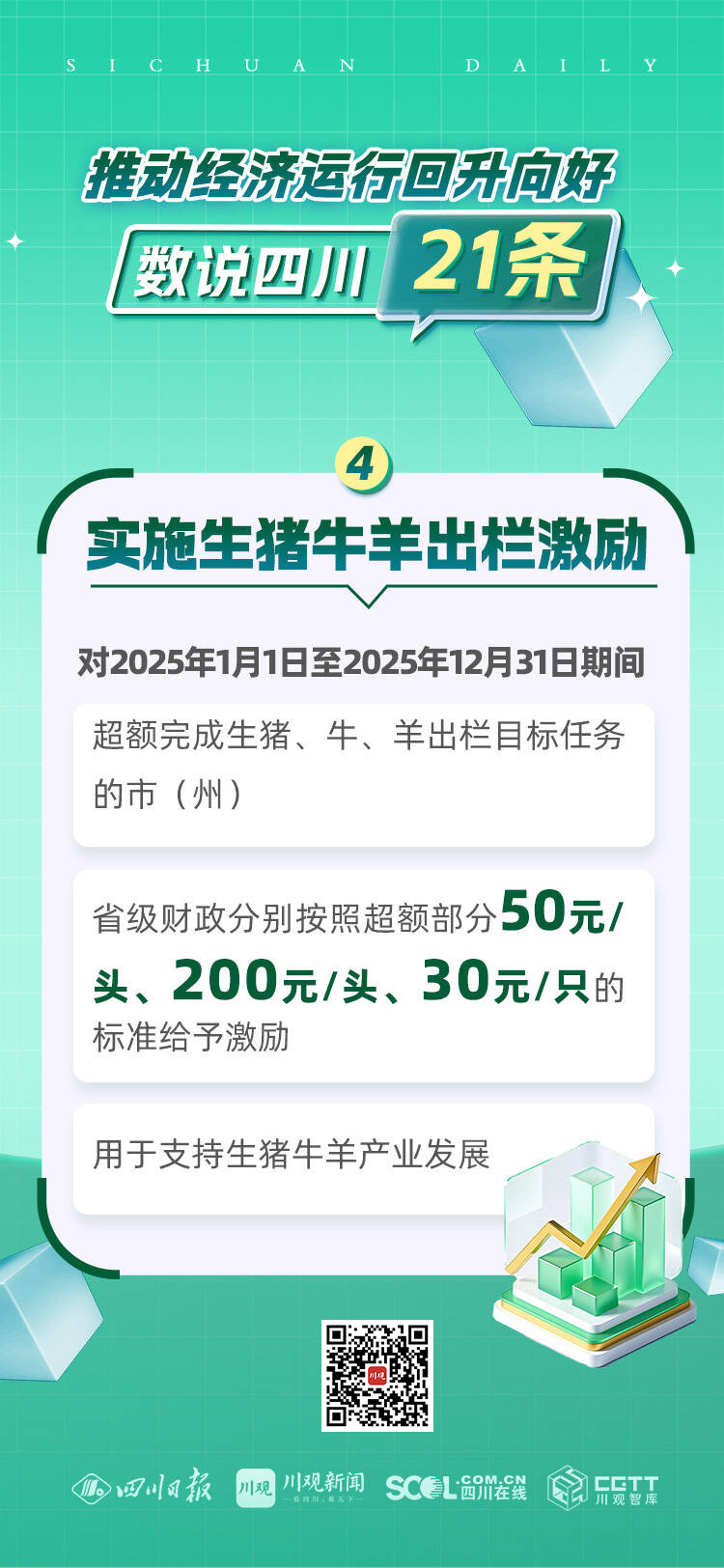 为了更好地保障猪肉等畜牧产品供给,此次“21条”提出对2025年1月1日至2025年12月31日期间,超额完成生猪、牛、羊出栏目标任务的市(州),省级财政分别按照超额部分50元/头、200元/头、30元/只的标准给予激励。