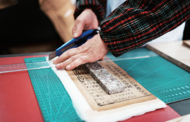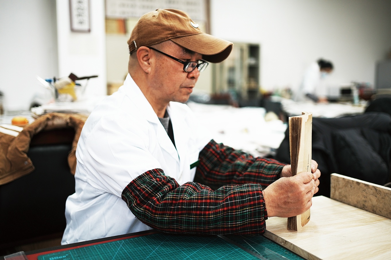 欧勇正在对修补好的《分类补注李太白诗》进行裁剪。