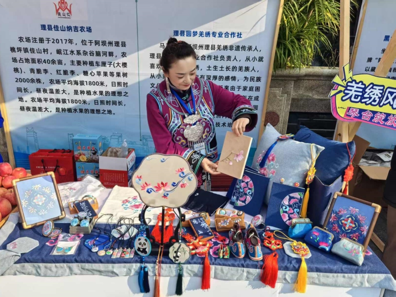 理县圆梦羌绣专合社负责人马琴芳和她的羌绣作品。