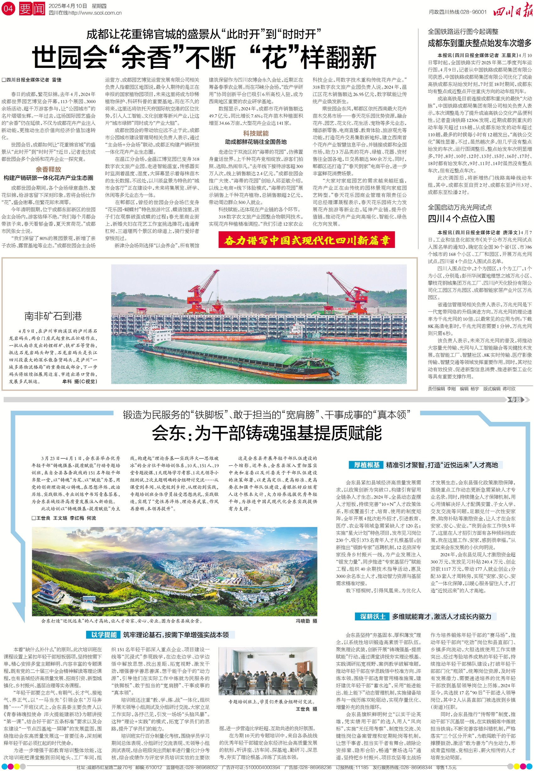 春日的成都,繁花似锦。去年4月,2024年成都世界园艺博览会开幕,113个展园、3000余场活动、超千万游客参与,让“公园城市”的名片熠熠生辉。一年过去,这场国际园艺盛会的“余香”仍在延续,不仅为成都花卉产业注入新动能,更推动生态价值向经济价值加速转化。世园会后,成都如何让“花重锦官城”的盛景从“此时开”到“时时开”?详情请关注今日四版。