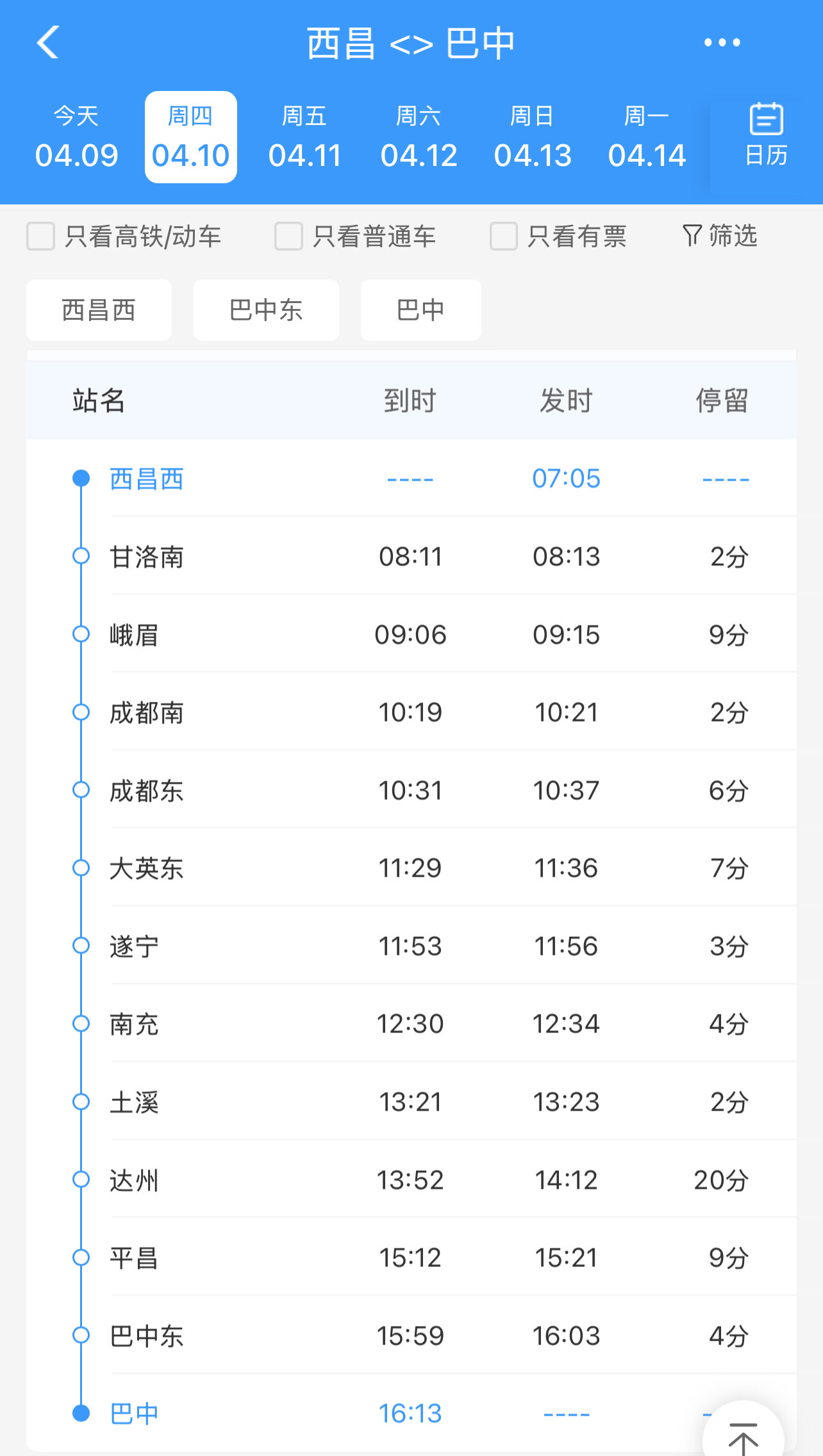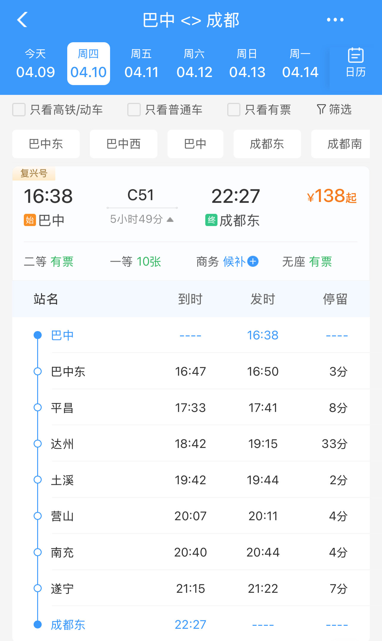 新增开的巴中至成都东C51次列车,巴中16:38开,沿途停靠巴中东、平昌、达州、土溪、营山、南充、遂宁等站,22:27抵达成都东,全程用时5小时49分。