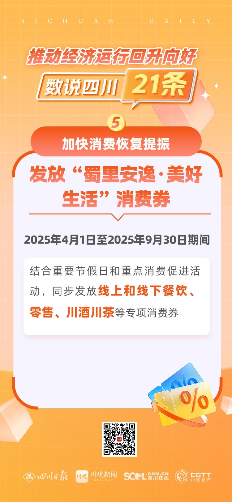 发放“蜀里安逸·美好生活” 消费券。2025年4月1日至2025年9月30日期间,结合重要节假日和重点消费促进活动,同步发放线上和线下餐饮、零售、川酒川茶等专项消费券。充分挖掘消费潜力,推动四川特色产业发展。所需资金由省级财政负担。