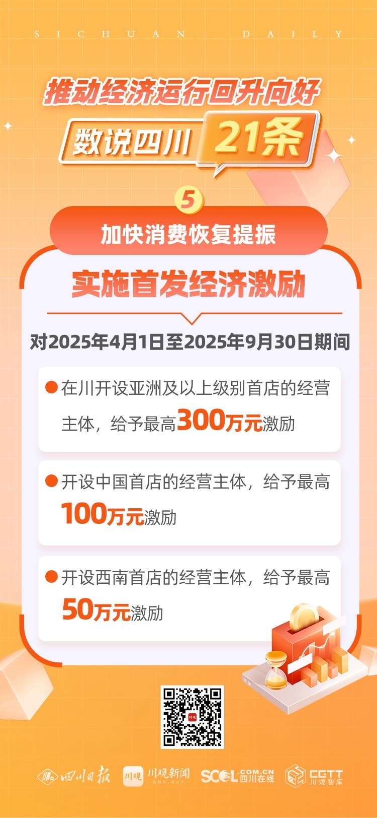 实施首发经济激励。对2025年4月1日至2025年9月30日期间,在川开设亚洲及以上级别首店的经营主体,省级财政给予最高300万元激励;开设中国首店的经营主体,给予最高100万元激励;开设西南首店的经营主体,给予最高50万元激励。